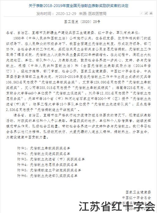近日,国家卫生健康委、中国红十字会总会、中央军委后勤保障部卫生局印发《关于表彰2018-2019年度全国无偿献血表彰奖励获奖者的决定》,县卫生健康委员会榜上有名,喜获无偿献血促进奖,成为全省唯一一家获此殊荣的卫生健康行政部门。