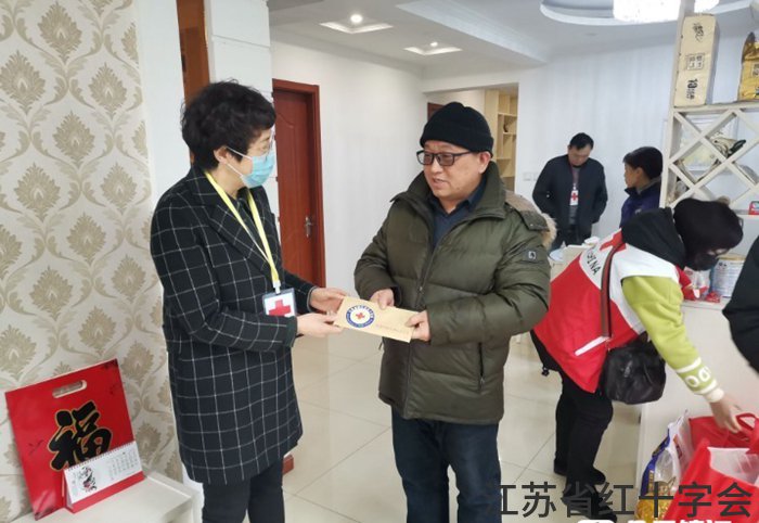 2月1日下午,镇江市红十字会领导和生命永恒红十字志愿者来到大病初愈的生命永恒志愿服务队志愿者袁怀宏家中,看望这位特殊的志愿者,并送上了米油和慰问金。