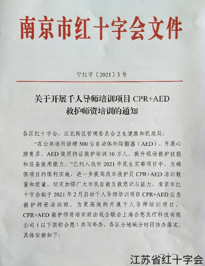 今年“在公共场所新增500台自动体外除颤器(AED),开展心肺复苏、AED使用持证救护培训10万人,提升现场救护技能和设备使用能力。”再次列入南京市民生实事项目。