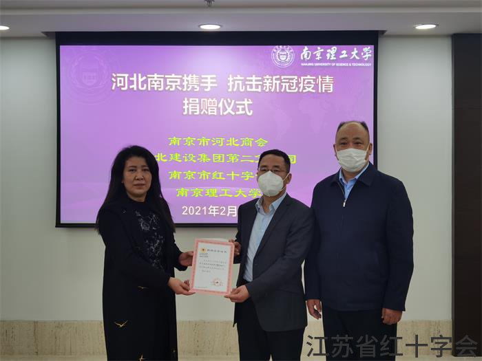 2021年2月9日,南京市河北商会执行会长朱国栋、南京市红十字会常务副会长张敏一行向南京理工大学捐赠防疫物资,捐赠仪式在南京理工大学学术会议中心举行,南京理工大学校医院院长胡勇主持捐赠仪式。南京理工大学党委副书记席占稳,校对外联络与发展部主任缪建红等参加了仪式。