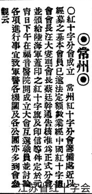 常州红十字分会筹备处近以经募之基本会员已逾法定额数,业经中国红十字总会会长汪大爕、副会长蔡廷干通告,核准为正式分会,并颁给陆海军盖印之红十字旗及印信等件。定于元宵日下午,在福音医院开成立大会,互选职员,并讨论各项进行事宜,致军警、各机关及各公团,亦多到会参观云。