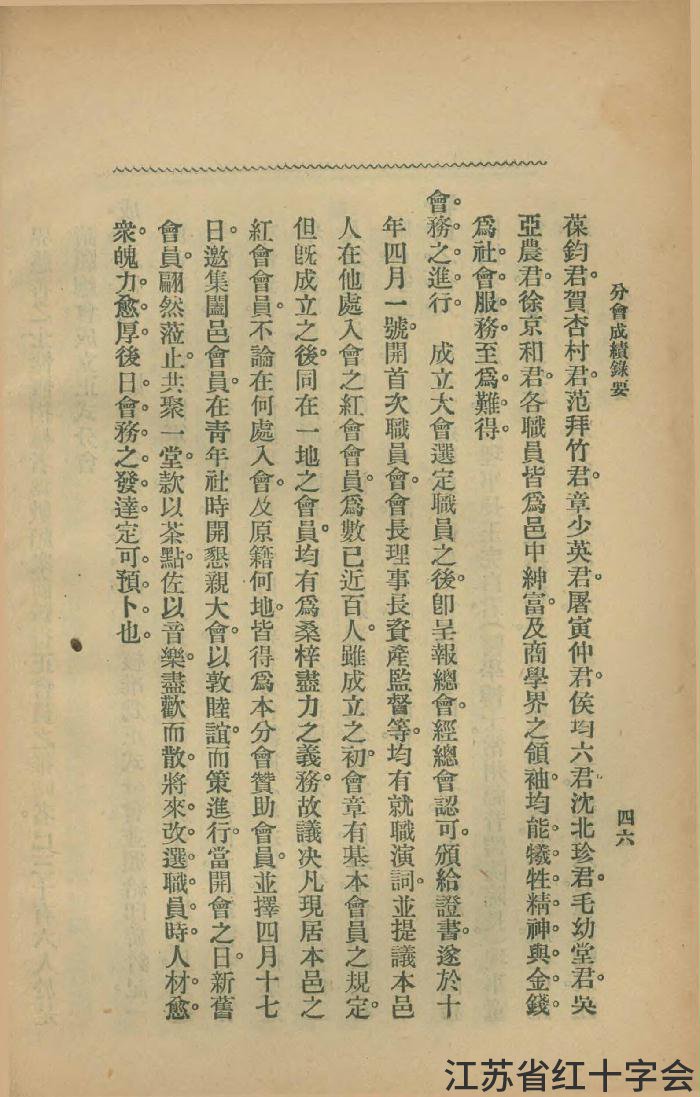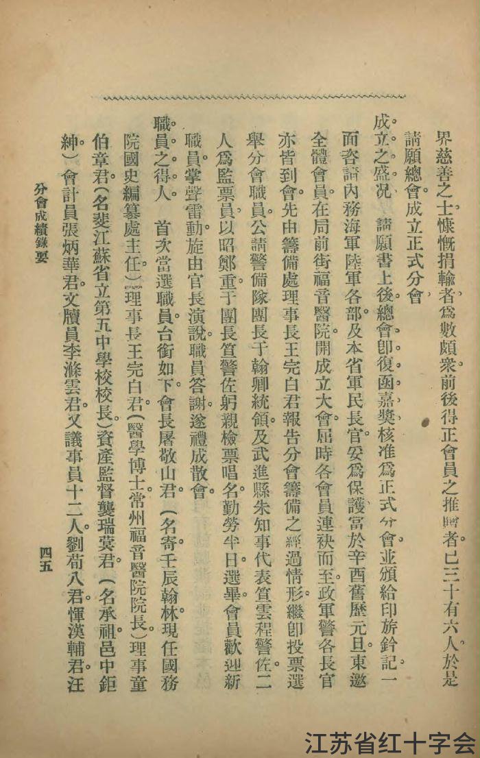 成立之盛况:请愿书上后,总会即复函嘉奖,核准为正式分会,并颁给印旗钤记,一面咨请内务、 海军、陆军各部及本省军民长官妥为保护。当于辛酉旧历元宵,东邀全体会员,在局前街福音医院开成立大会。届时,各会员连袂而至,政军警各长官亦皆到会。先由筹备处理事长王完白君报告分会筹备之经过情形,继即投票选举分会职员,公请警备队团长于翰卿统领及武进县朱知事代表笪云程警佐二人为监票员,以昭郑重。于团长、笪警佐躬亲检票唱名。勤劳半日。选毕,会员欢迎新职员,掌声雷动。旋由官长演说,职员答谢,遂礼成散会。
