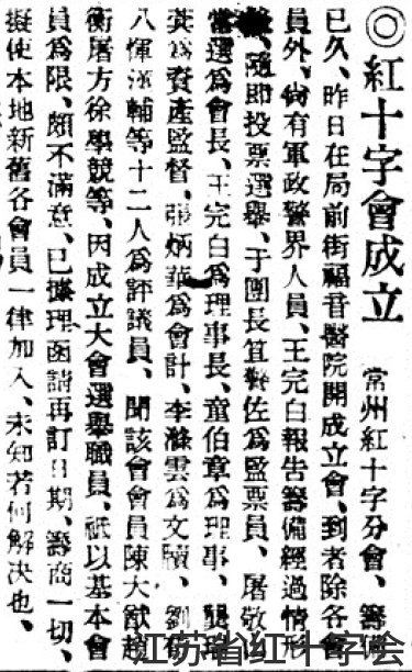常州红十字分会筹备已久,昨日在局前街福音医院开成立会,到者除各会员外,尚有军政警界人员。王完白报告筹备经过情形等。随即投票选举,于团长、笡警佐为监票员,屠敬山当选为会长,王完白为理事长,童伯章为理事,龚瑞蓂为资产监督,张炳华为会计,李涤云为文牍,刘荀八、恽汉辅等十二人为评议员。闻该会会员陈大猷、赵衡、屠方、徐学竞等,因成立大会选举职员,只以基本会员为限,颇不满意,已据理函请再订日期,筹商一切。拟使本地新旧各会员一律加入,未知若何解决也。