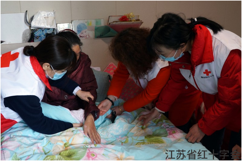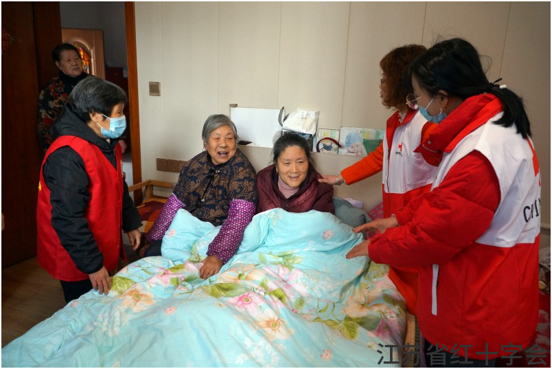 3月2日,一个温暖的日子,金坛区红十字养老照护1队,来到东园社区朱维萍家中。朱维萍今年67岁,患有渐冻症瘫痪在床近三十年,一直靠现今89岁的母亲照顾。志愿者们送上米油一次性护理垫等物资,养老照护师黄英针对朱维萍的现状,指导按摩防肌肉萎缩、指导饮食营养与防噎等瘫痪病人的护理要点。虽然渐冻症已渐渐发展到胸肺部,朱维萍讲话已开始吃力了,但她仍然很高兴,她说,感谢妈妈一直照顾我,谢谢大家今天来看我、陪我说说话儿。