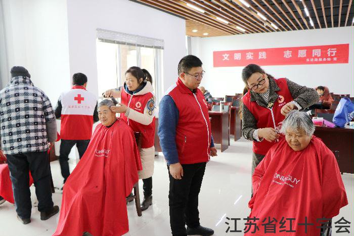 在东进路社区党群服务中心三楼博爱讲堂,红十字志愿者为25位老年朋友及13名网格员发放物资、用互动的方式开展春季养老照护知识与技能培训,让在场的老年人跟着节奏动起来,让年轻的网格员学到知识用起来,共同提高健康保障和服务能力;在社区活动室,五位资深理发师志愿者分工配合,轻柔娴熟地给35位老人理发,让老人如沐春风;对于9位行动不便的老人,志愿者们三人一组登门入户进行探望慰问,并进行血压测量、指甲修剪、按摩谈心服务,让老人感觉轻松愉悦。