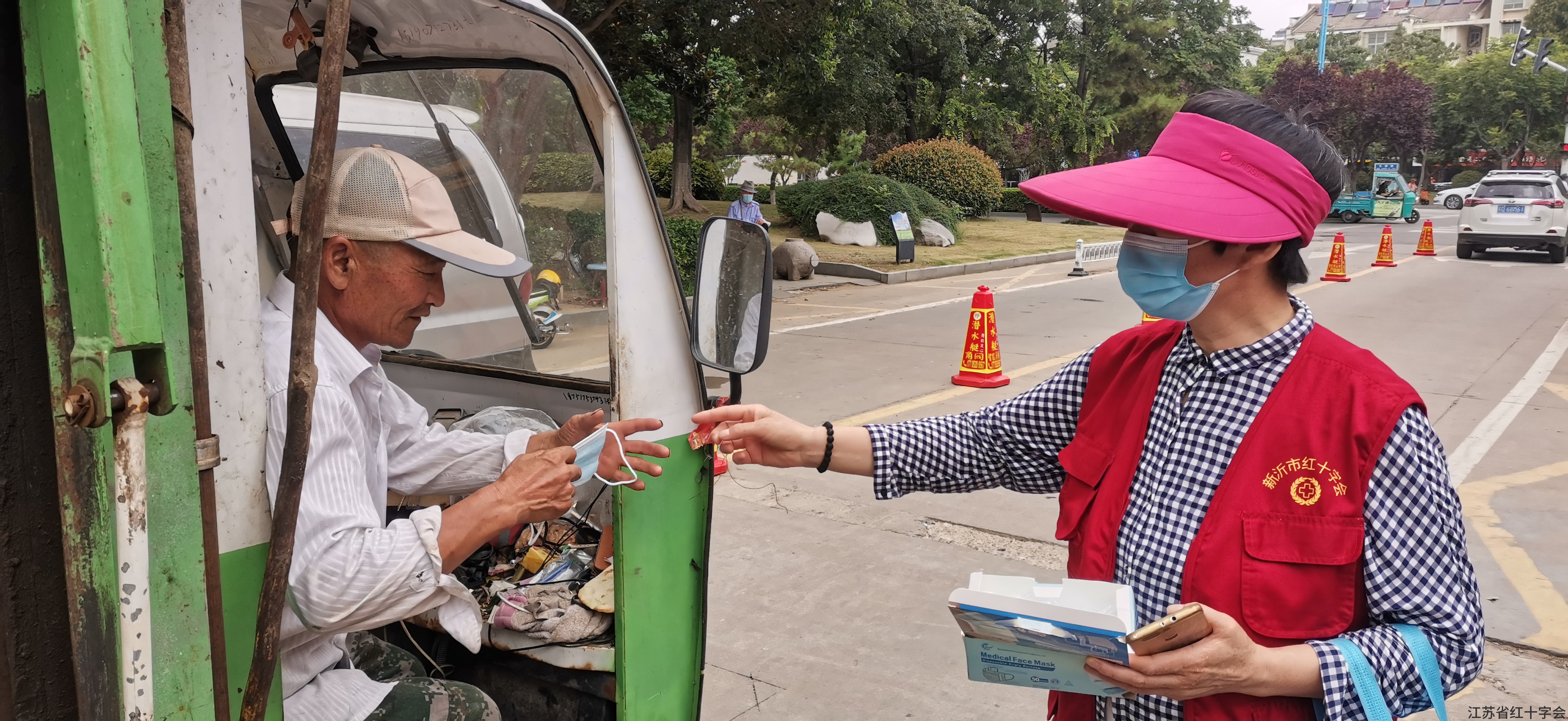 近日,新沂市红十字志愿者走上街头,为未带口罩的市民发放口罩。