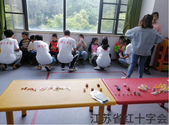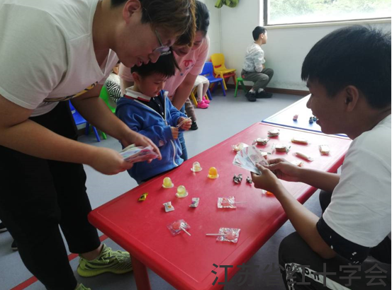 志愿者们到达小星星康复中心之后分为三个小队进入大、中、小班开展活动,志愿者分好儿童教学币,将各种商品:糖果、零食、萌宠小猪、小企鹅、小兔子和发卡发圈还有玩具消防车等整齐摆放在桌子上。志愿者们各自拿着的教学币教小朋友认识货币:“小朋友,这是多少钱呀?对!这个呢?”