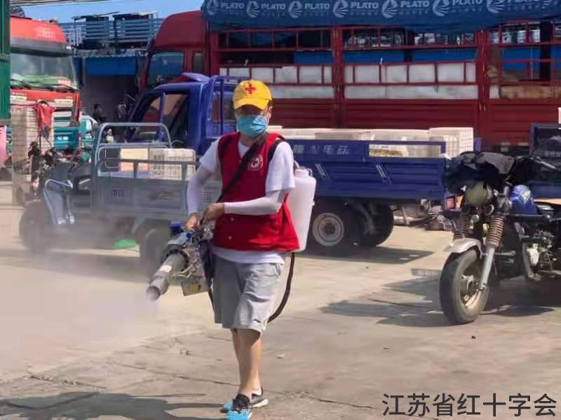 8月7-8日,利用双休日的时间,阜宁县红十字会志愿者随着保障车辆来到鸿泰农贸市场、明生水果蔬菜批发市场等地点继续为农贸市场开展疫情防控消杀工作。