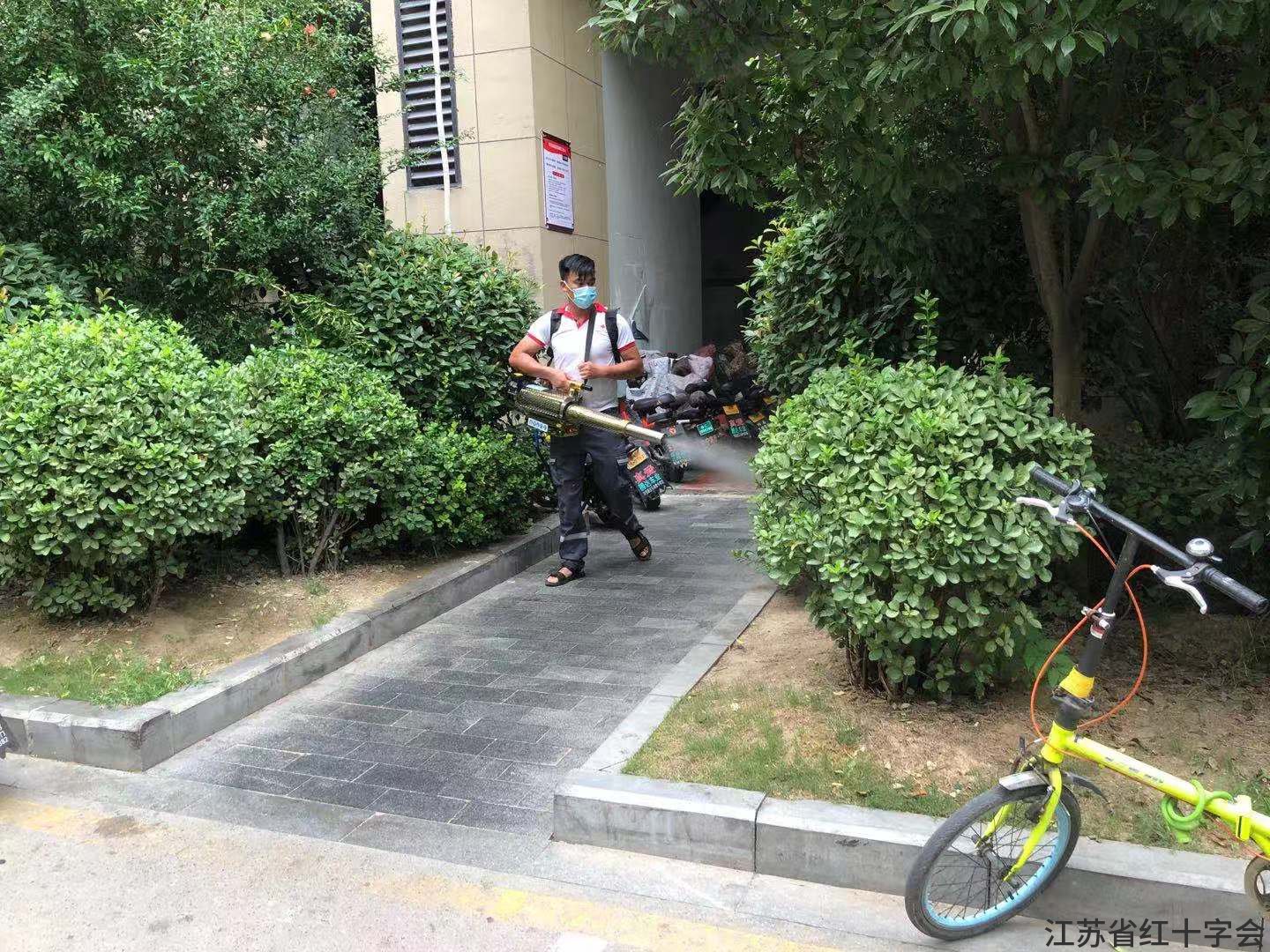 在社区工作人员的指引下,沛县红十字会赈济救援队的志愿者背着专业消毒弥雾机,对辖区内的小区道路、垃圾桶站、健身场所、楼道楼梯等领域进行卫生消毒清理。