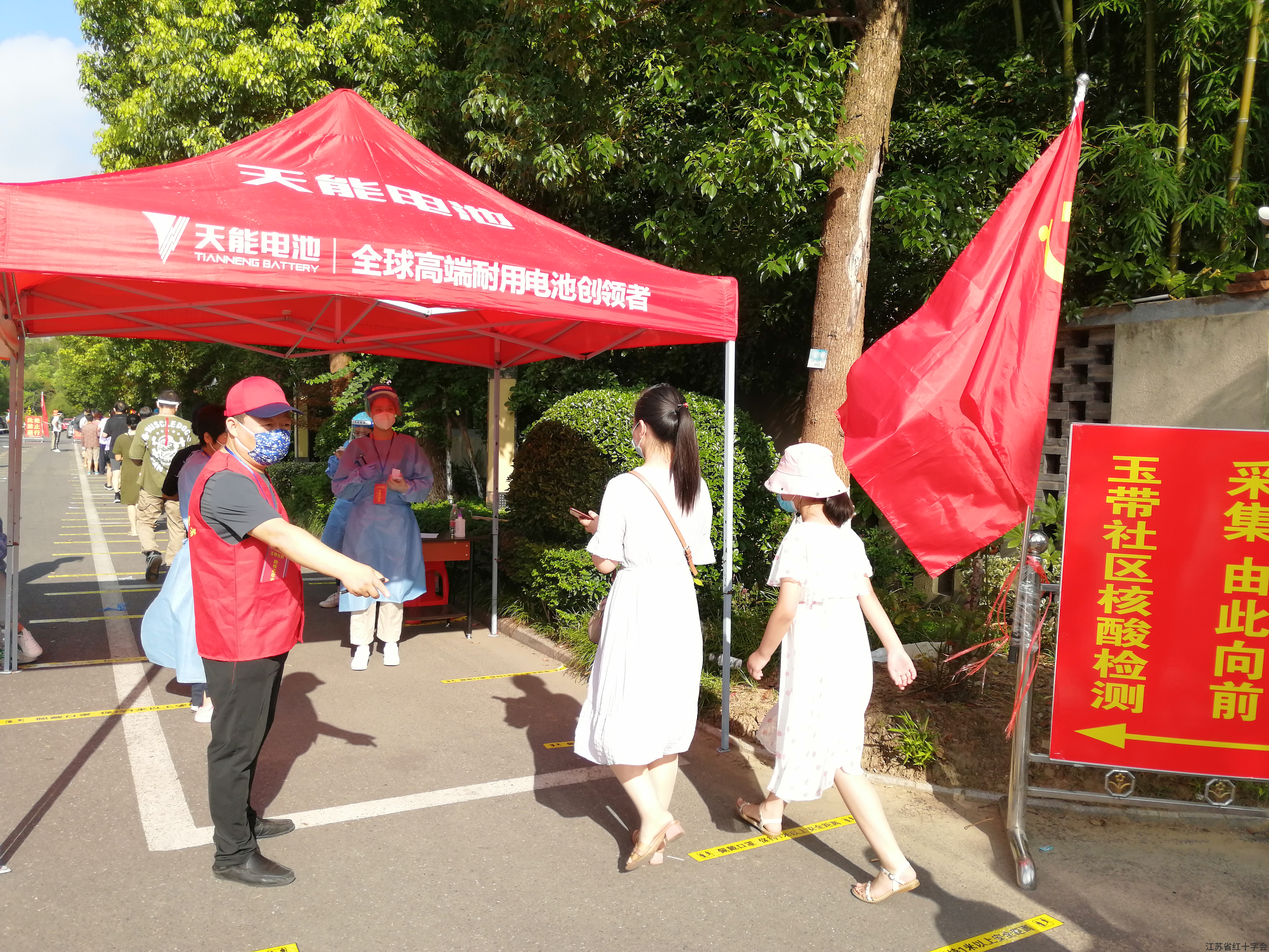 检测当天,现场社区红十字会工作人员与150名志愿者们早早地来到采样点,大家按部就班,站好自己的岗位,担好自己的岗位职责,所有人都全力以赴,各项工作忙而有序,居民积极配合,打好这场没有硝烟的战斗。随处可见到身穿红衣志愿者的身影是最靓丽的风景线,他们站在烈日中,汗水把衣服浸湿了一遍又一遍,仍然坚守岗位。党员时兴、朱明德在外围巡回提醒群众戴口罩,提前准备好身份证;企业代表滕承顺站大门岗一边维持秩序,一边举着高音喇叭不停地重复请出示苏康码、行程码;退役军人顾成旭为了避免在检测中造成人员的密切聚集,阻断检测时的隐藏风险,保障居民的人身安全,说得最多的是“请注意保持间隔”、不插队、不拥挤”等等... ...让鲜红的党旗在战“疫”一线高高飘扬。针对老年人、行动不便等特殊群体,开辟绿色通道,对需要上门的安排工作人员、医护人员上门采样服务,提高采样效率,确保应检尽检,不漏一人。三次全民核酸检测15000人次,完满完成任务。核酸检测点营造良好的氛围受到上级领导的表扬和群众的认可。
