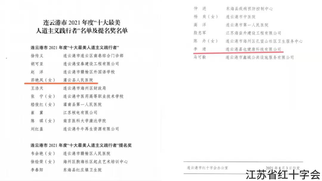 近日,从连云港市红十字会传来好消息:在市委宣传部、市红十字会联合开展“最美人道主义践行者”评选活动中,灌云县人民医院医务人员茆艳凤荣获连云港市2021年度“十大最美人道主义践行者”称号,嘉也健康科技有限公司总经理李靖荣获2021年度“十大最美人道主义践行者”提名奖。
