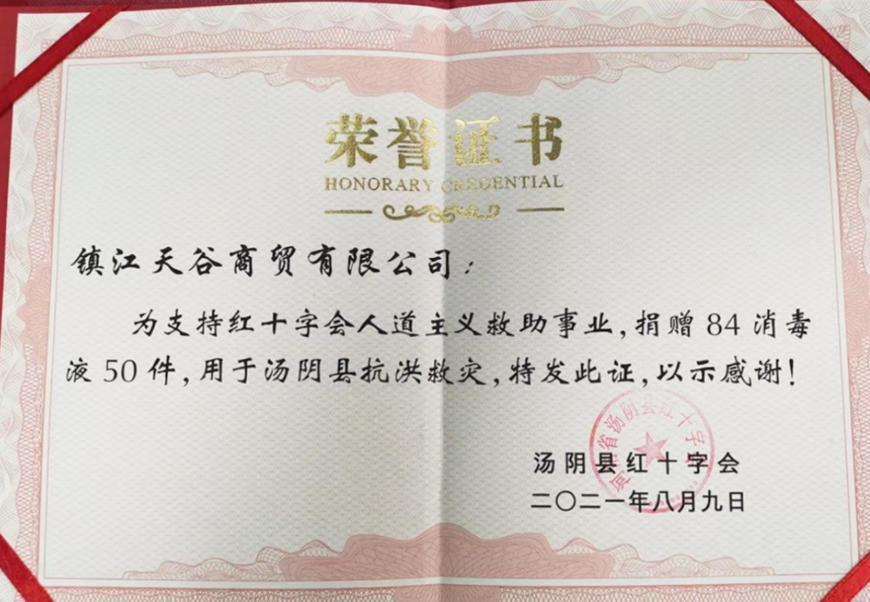 8月9日汤阴县红十字会给镇江天谷商贸有限公司,给镇江市红十字博爱人生志愿者队志愿者镇江天谷商贸有限公司经理甘泽民寄来了荣誉证书,对镇江市红十字博爱人生志愿者队志愿者表示感谢。