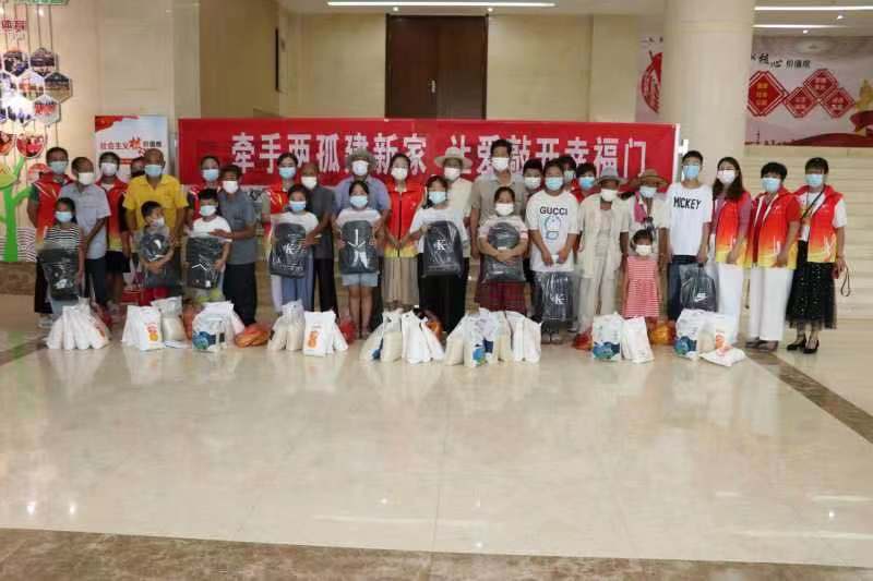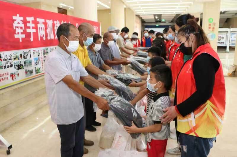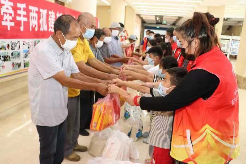 8月31日下午,沛县红十字言让公益联盟16名志愿者带领自已结对帮扶的10名孤儿,拎着米、面、奶粉,来到杨屯镇新时代文明实践所,和10位孤寡老人结对认干亲,按照就亲、就近、就便的原则和志愿者+孤老+孤儿,一对一或多对一的方式,组建新家庭,一声脆脆“爷爷、奶奶”驱散了孤寡老人的寂寞和孤独,送来欢乐和幸福,“两孤”幸福的拥抱在一起,那一刻诉说的是幸福的甜蜜,流下的是幸福的泪水,咽下的是家的味道,找到的是久违的爱和"心″归属