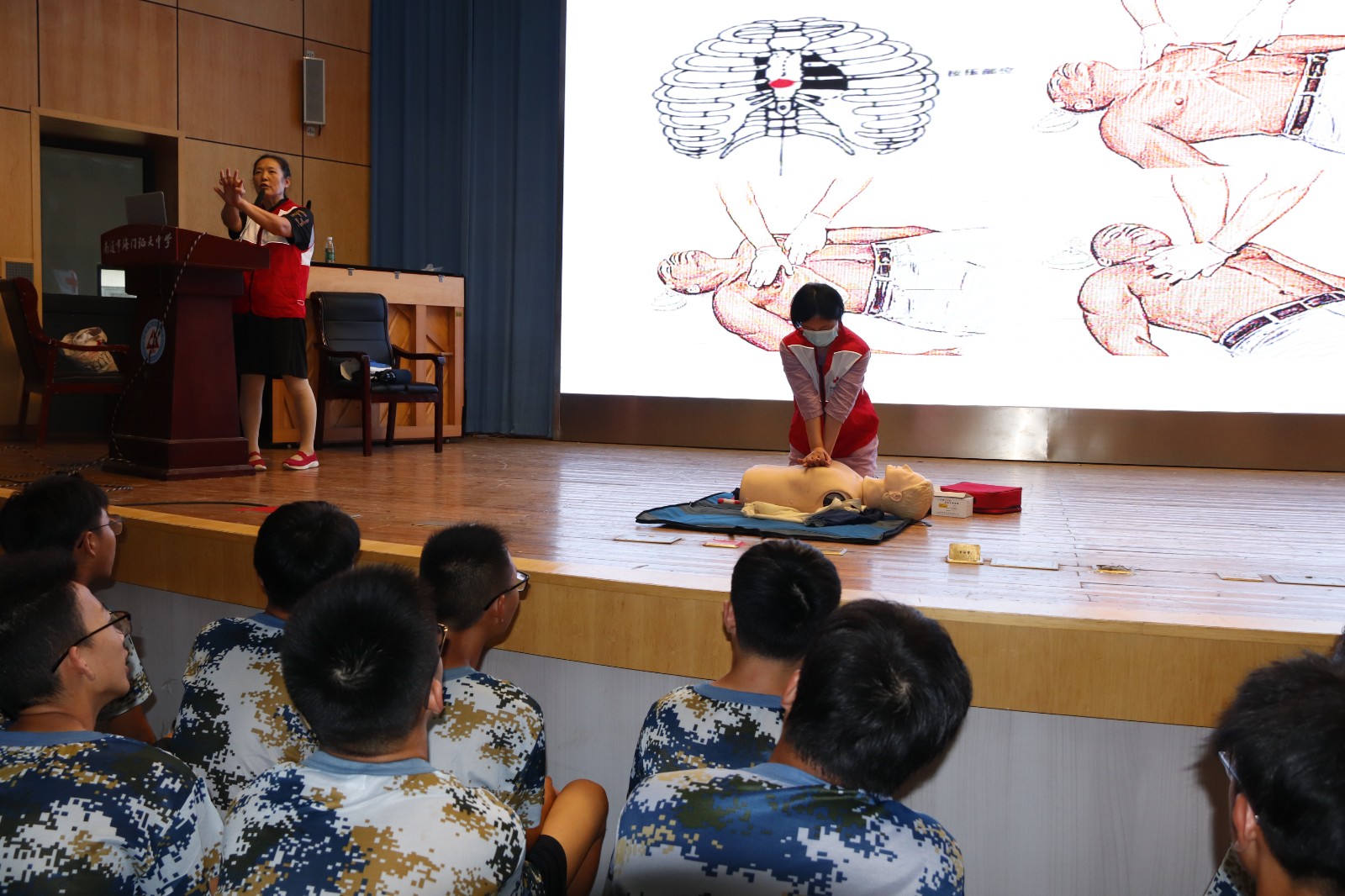 区红十字会培训老师用生动的语言,结合生活中常见的意外伤害,为同学们讲解了实用的急救知识,包括急救的基本常识、气道异物梗塞急救、心肺复苏技能和AED的使用,并通过现场模拟的方式,全面展示了突发事故的现场救助流程。培训现场气氛热烈,同学们热情高涨,认真听讲,积极互动。