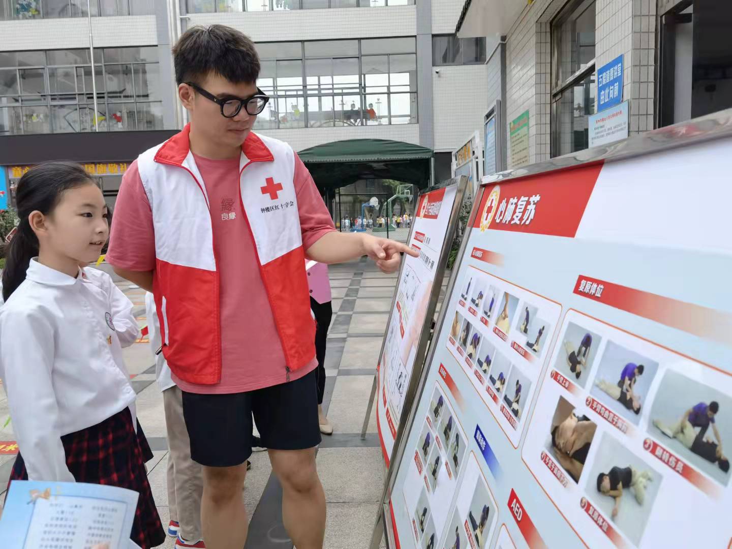 勤业小学的操场上,摆放了各类急救知识的展板,社区红十字志愿者带领同学们通过观看展板,分发《儿童急救常识》的小册子,讨论交流,学习急救知识,了解急救技能,增强遇到突发受伤状况的应变处置能力。在勤一社区专门定做的小册子上,用简洁明晰的语言详细讲述了包括鼻子出血、食物中毒、烫伤、踝扭伤等各类受伤情况出现后的应对方法和注意事项,其中的《急救知识口诀》,更是朗朗上口。同学们通过朗诵口诀,将急救知识要点牢记于心,取得了良好的效果,受到了老师、同学和家长们的一致好评。