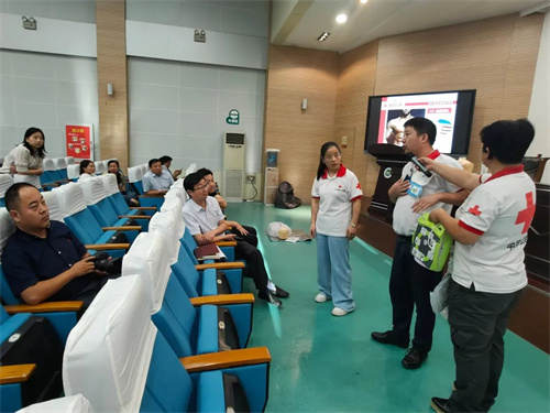 在培训课堂上,盐城市红十字会应急救护培训老师利用大屏幕,结合讲解、现场演示等方式,向老师们介绍了止血包扎、气道异物梗阻、心肺复苏及AED使用等知识。