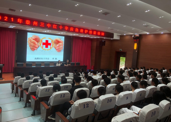 为进一步提高校园应对突发事件和应急救护的能力,保障师生生命安全。9月16日下午高港区刁铺街道红十字会走进泰州第三高级中学开展普及性应急救护培训活动。此次活动邀请了李娟主任担任培训主讲,为了扎实深入开展好此次活动,培训老师精心准备,本着“贴近学生、贴近生活、浅显实用、操作技能为主”的原则,围绕心肺复苏、创伤救护、突发事件与意外伤害等应急救护知识技能,采用多媒体教学手段,利用PPT课件展示,播放视频,化抽象为直观,使培训学生学习应急救护知识兴趣更加浓厚,培训气氛更加活跃。学生们纷纷表示,此次培训很有收获,不仅对急救知识有了更深入的了解,而且掌握了一定的应急救护技能,一旦遇到紧急情况,不但可以利用所学急救知识开展自救,也能伸出援手救助他人,真正做到“人人学急救,急时救人人”。