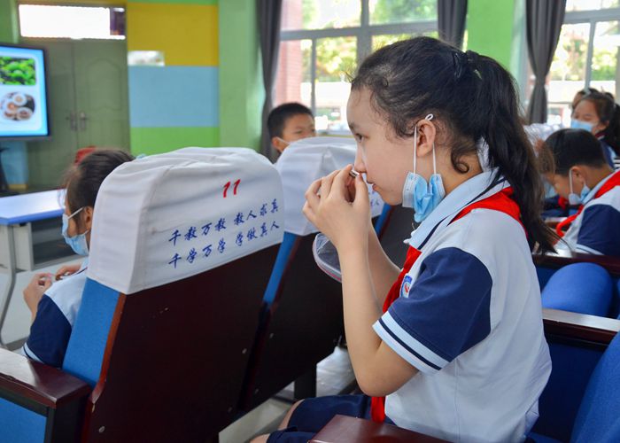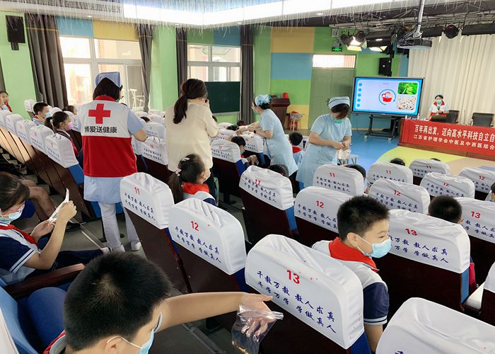最后,为了增强学生们疫情防控常态化意识,红十字志愿者江苏省级专科护士顾婷结合当前疫情防控要求,为学生们进行了“防护从我做起”的小讲课,包括咳嗽礼仪,手卫生以及正确佩戴口罩的健康知识。“从我做起,保护你我”,同学们学习的劲头可足啦!积极参加现场互动环节的同学还获得了中医院自制的“防感冒香囊”奖励。