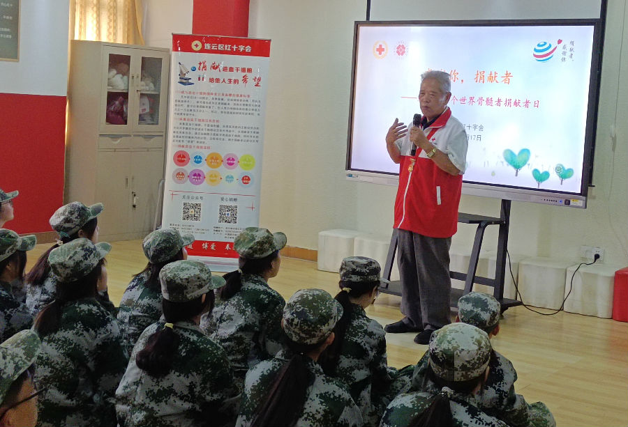9月17日,连云区红十字会赴宿城教育基地面向青少年红十字会员开展“世界骨髓捐献者日”主题宣传活动。活动中,连云区红十字会常务副会长罗雁向同学们介绍造血干细胞相关知识以及造血干细胞捐献的意义。徐传义,一名老党员、老军医、资深的红十字人,最美人道主义践行获得者为大家讲述了关于造血干细胞的故事。红十字会青少年会员们听完非常感动,认真学唱造血干细胞捐献主题公益歌曲《多幸运遇见你》,用深情演唱的方式表达对捐献者的崇敬!