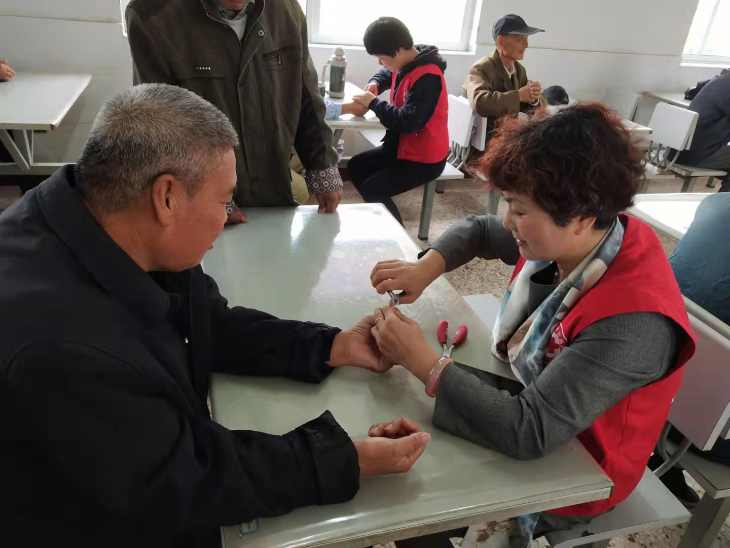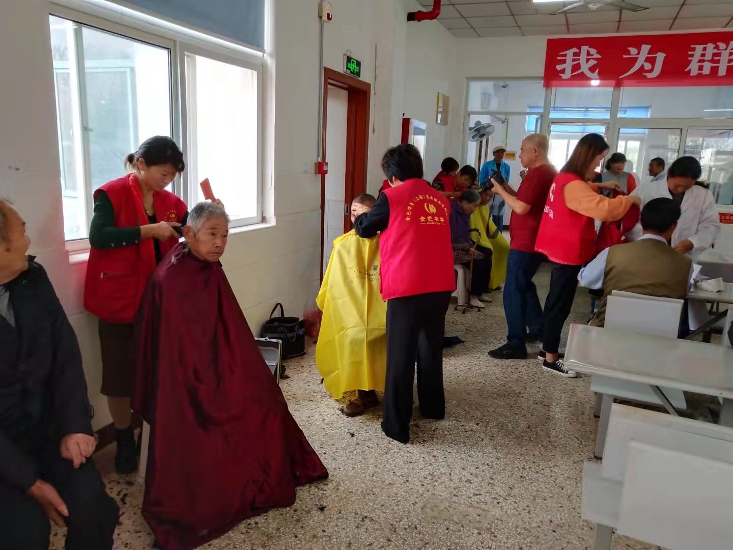 30多名志愿者分工明确,一组志愿者一边为老人理发、剪指甲、修脚,一边陪老人闲谈,受到了老人们的一致好评;另一组志愿者一边为老人分发带来的瓜子、花生、香蕉、橘子等,一边用自编自演的文艺节目为老人们送上精神大餐,赢得了老人们的阵阵掌声。医护人员为老人义诊、量血压、提供咨询服务。最后,志愿者们为每位老人送上一份节日礼物,包括一箱牛奶、两袋芝麻糊和一条毛毯。
