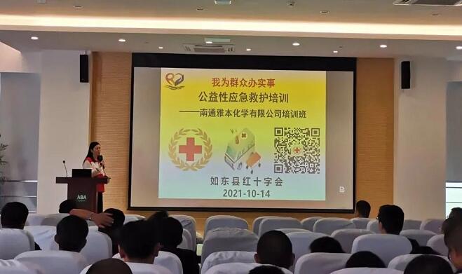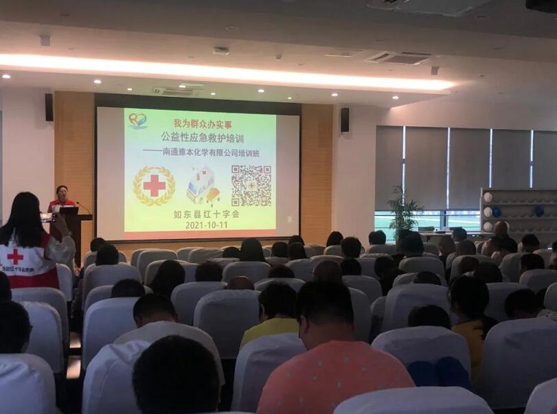 10月11日、14日,如东县红十字会应急救护培训师资志愿者走进南通雅本化学有限公司,开展应急救护知识科普培训。针对企业生产实际,老师采取理论讲解+操作演示的方式,普及了心肺复苏、AED使用技术,以及爆炸、火灾等意外伤害自救逃生避险急救技能。公司全员近340人分两批参加培训,部分员工代表进行了实践体验。
