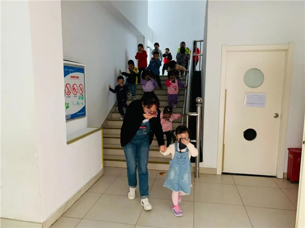 演练时,随着消防警报声的响起,负责楼道和安全出口的教职工迅速到位,全体教职工立即停下手中的工作,园内各场所幼儿立即暂停游戏、活动,在教师的带领下拿好湿毛巾捂住口鼻、弯腰匍匐沿既定逃生路线从相应楼层的相应楼梯口撤离至教学楼外的空旷操场集合。到达操场后,各班级老师清点幼儿人数,并向总指挥报告应道与实到人数,总时长2分56秒。