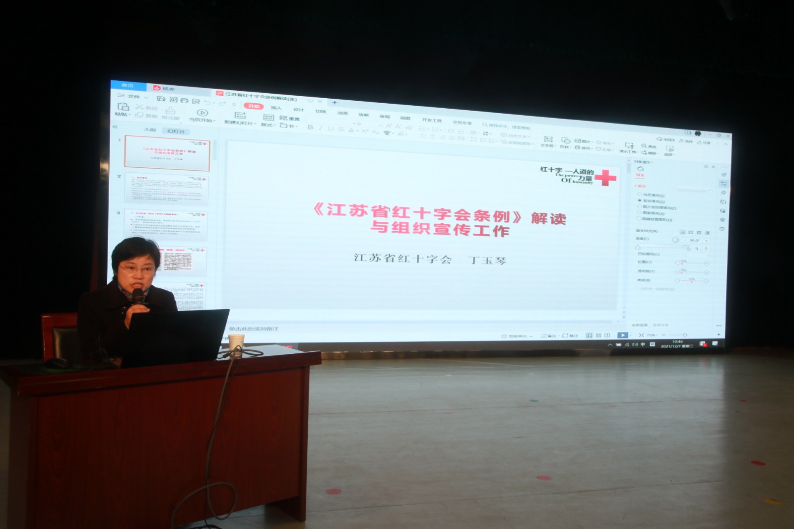 丁玉琴对我市开展创建省级红十字示范校工作表示肯定,同时也提出了意见和建议。随后宣讲《江苏省红十字条例》,从立法的意义、背景、《条例》的内容、亮点、《条例》需要重视的方面以及宣传贯彻《条例》等六个方面进行详细解读,并对《条例》中容易模糊的概念进行了梳理和纠正。