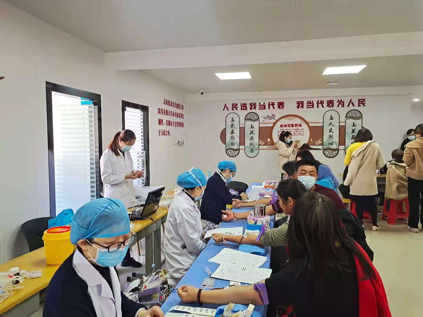活动现场,献血志愿者们在镇红十字志愿者的指导下,按序完成献血登记、填表、量血压、测血型等准备工作,取样合格后,再进行血液采集。医护人员在采血过程中,向献血志愿者们耐心讲解相关注意事项,献血活动有序进行。