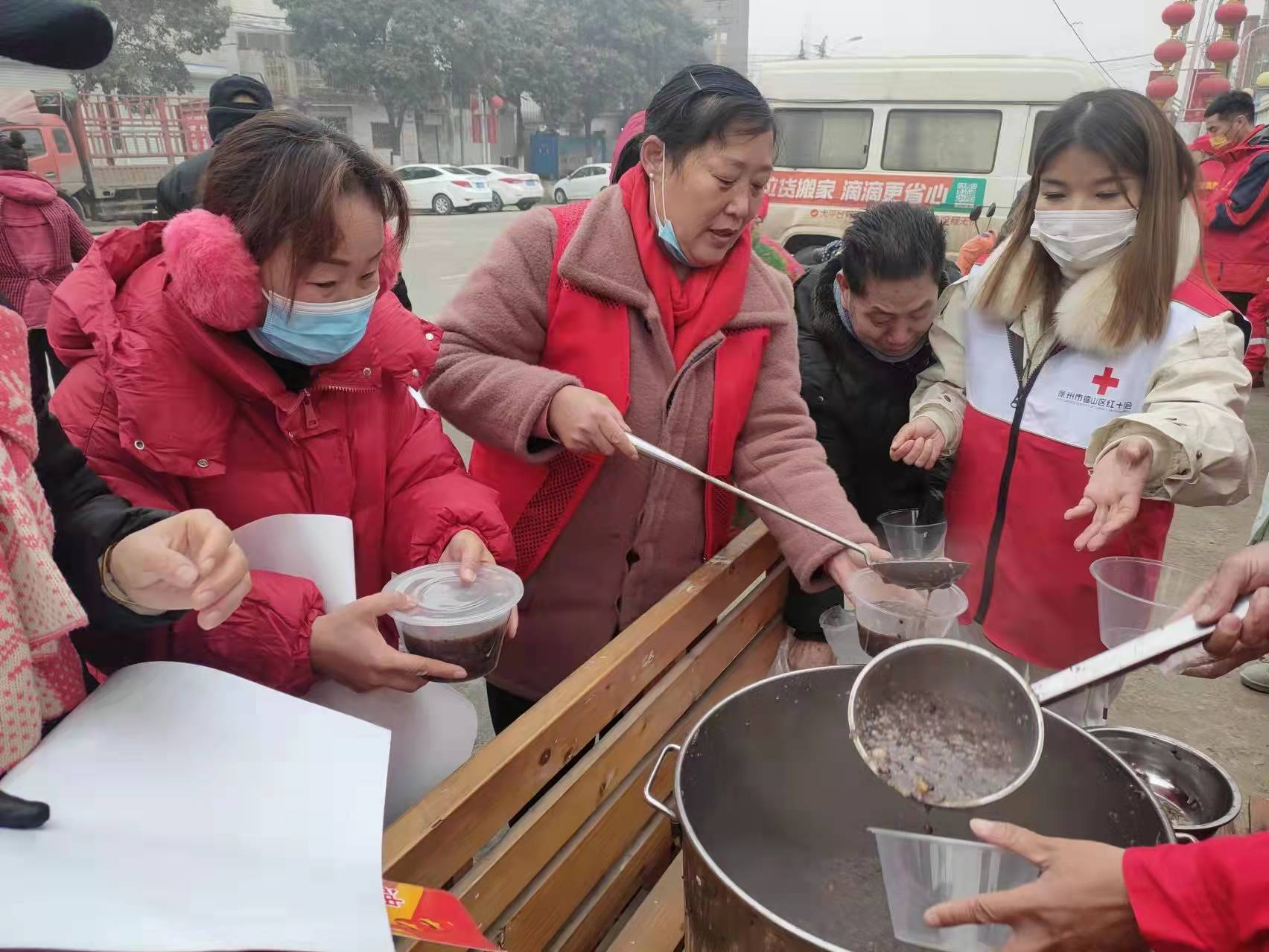 区红十字救援队志愿者天没亮就开始着手准备材料和工具精心熬制腊八粥,熬制完成后打包装盒。为养老院的老人们、环卫工人和派出所的工作人员及周边居民送上一碗爱心腊八粥。