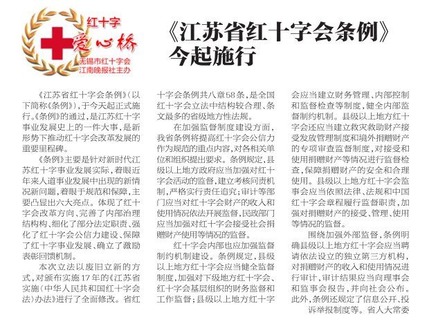 结合多媒体典型宣传。市红十字会在门户网站、微信公众号、《江南晚报》“红十字爱心桥”、无锡电台“红十字之声”等开设专栏,召开新闻发布会、座谈会等形式在媒体广泛宣传《条例》内容、创新亮点,并系统解读《条例》,刊发系统内学习宣传贯彻动态,扩大宣传面,提高知晓率,大力宣传红十字事业发展进程中涌现出的先进人物和感人事迹。
