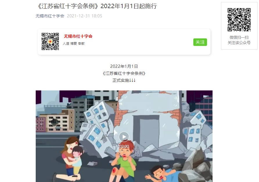 各学校红十字会开展多形式活动。无锡职业技术学院在校园开展3场“秉承人道使命、传递幸福理念、谱写博爱篇章”《条例》宣讲活动,发布微信公众平台推文,覆盖人群超过2000人;市第三高中、无锡机电高等职业学校、无锡实验幼儿园等将《条例》宣传视频在校园电子屏滚动播放,分发到各家长群邀请观看留言,设置健康教育专栏和橱窗;积余实验学校将《条例》宣讲和红十字急救技能培训相结合,江南中学组织全校师生开展《条例》宣讲会和主题班会活动,设置班会课教案,用情境导入、朗诵、分享的形式引导广大红十字青少年学习理解《条例》,领悟红十字会的职责、懂得红十字标志的含义和用法。