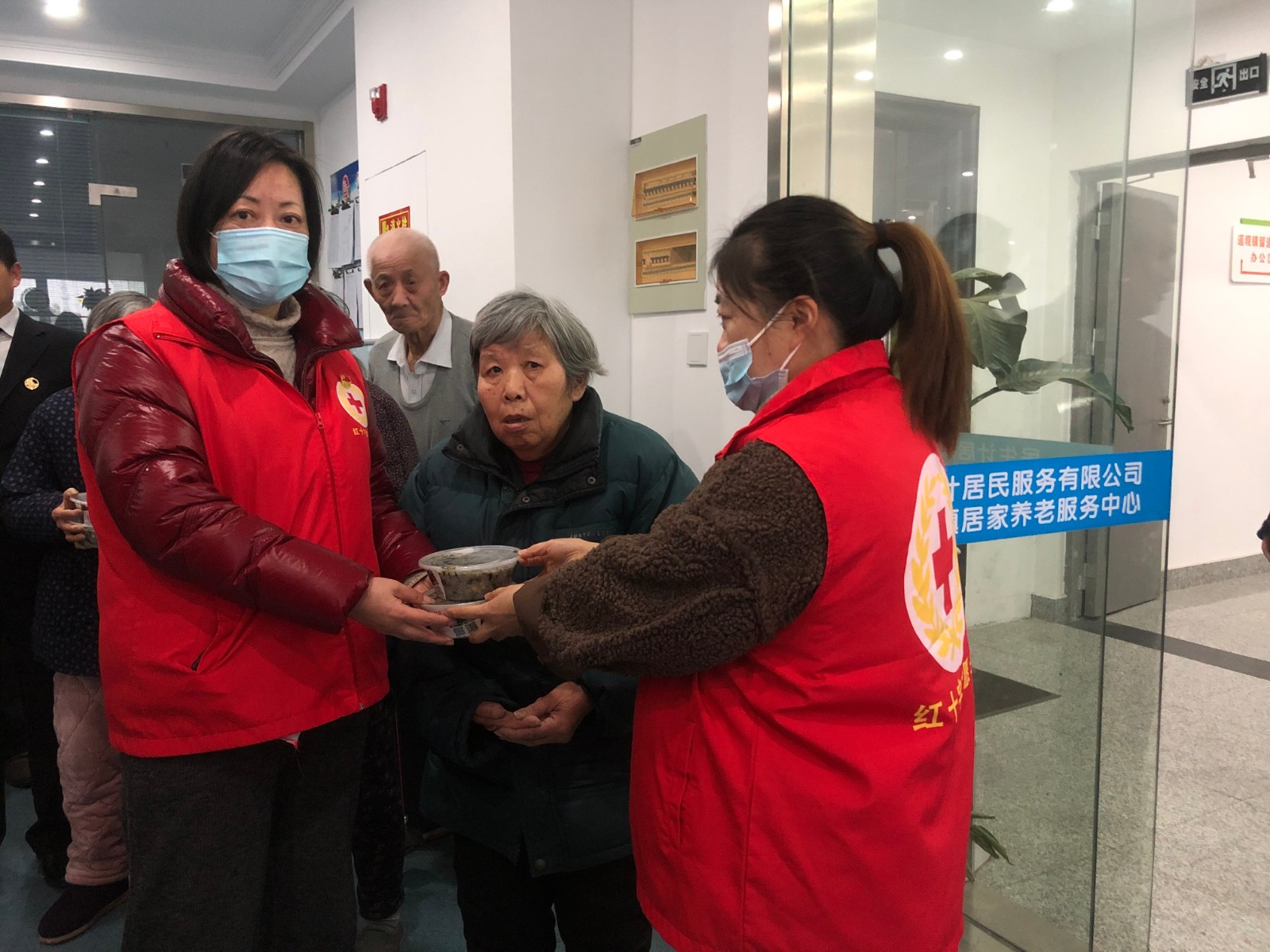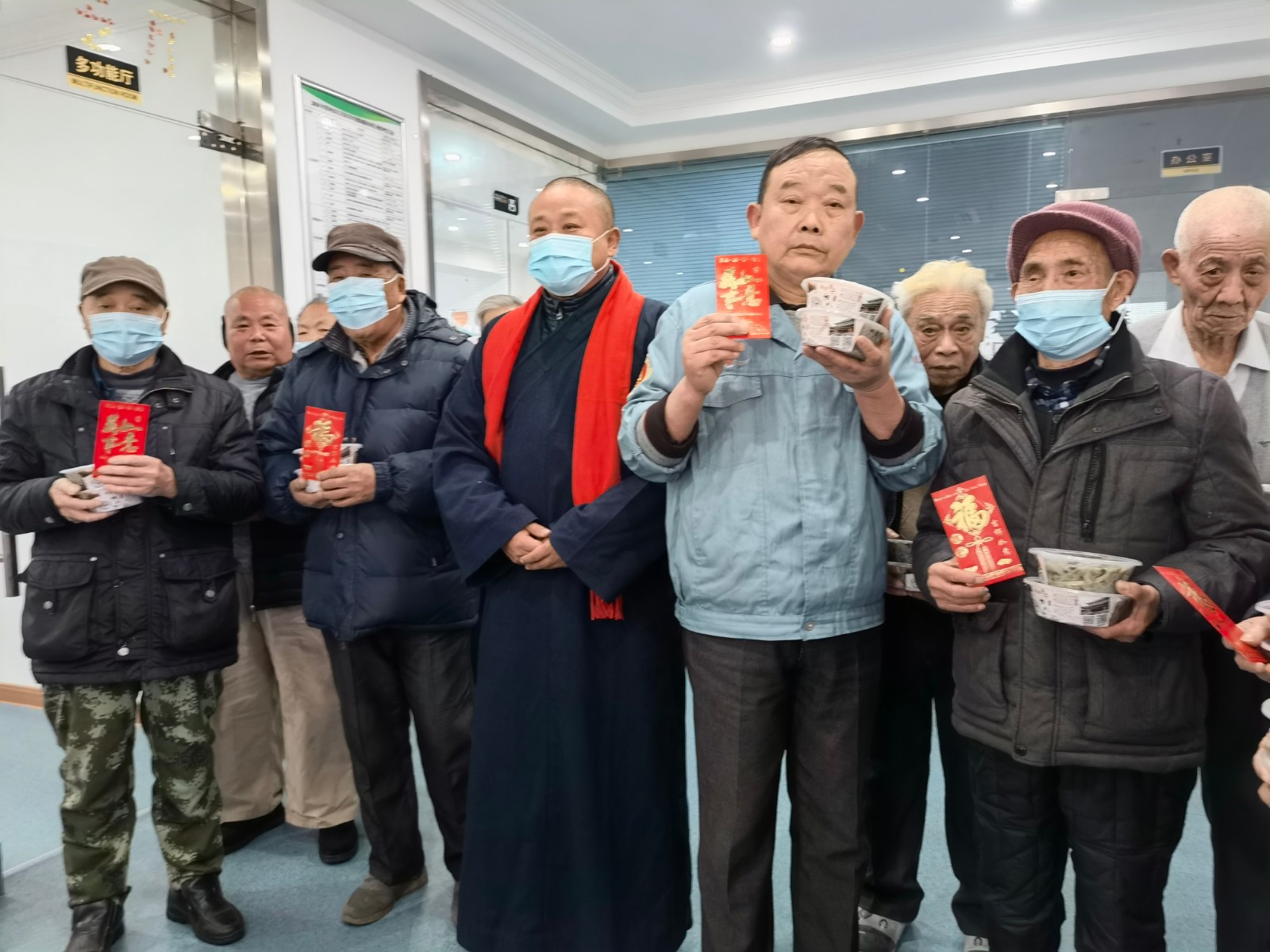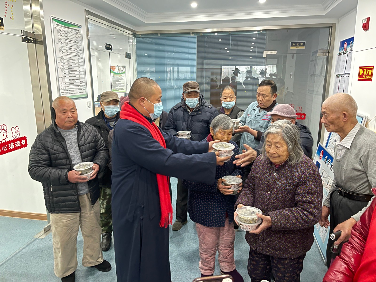 师傅亲切地与老人们交谈,关心他们的生活情况与健康情况,叮嘱老人要保重身体。红十字志愿者们拉着老人的手拉家常,聊生活,为老人们带去精神慰藉,向他们致以节日问候,送上关怀和温暖。老人们手捧腊八粥,脸上洋溢着藏不住的温暖与快乐,感慨道:“谢谢你们过来看望我们,能和这么多人热热闹闹的过腊八,很开心。”