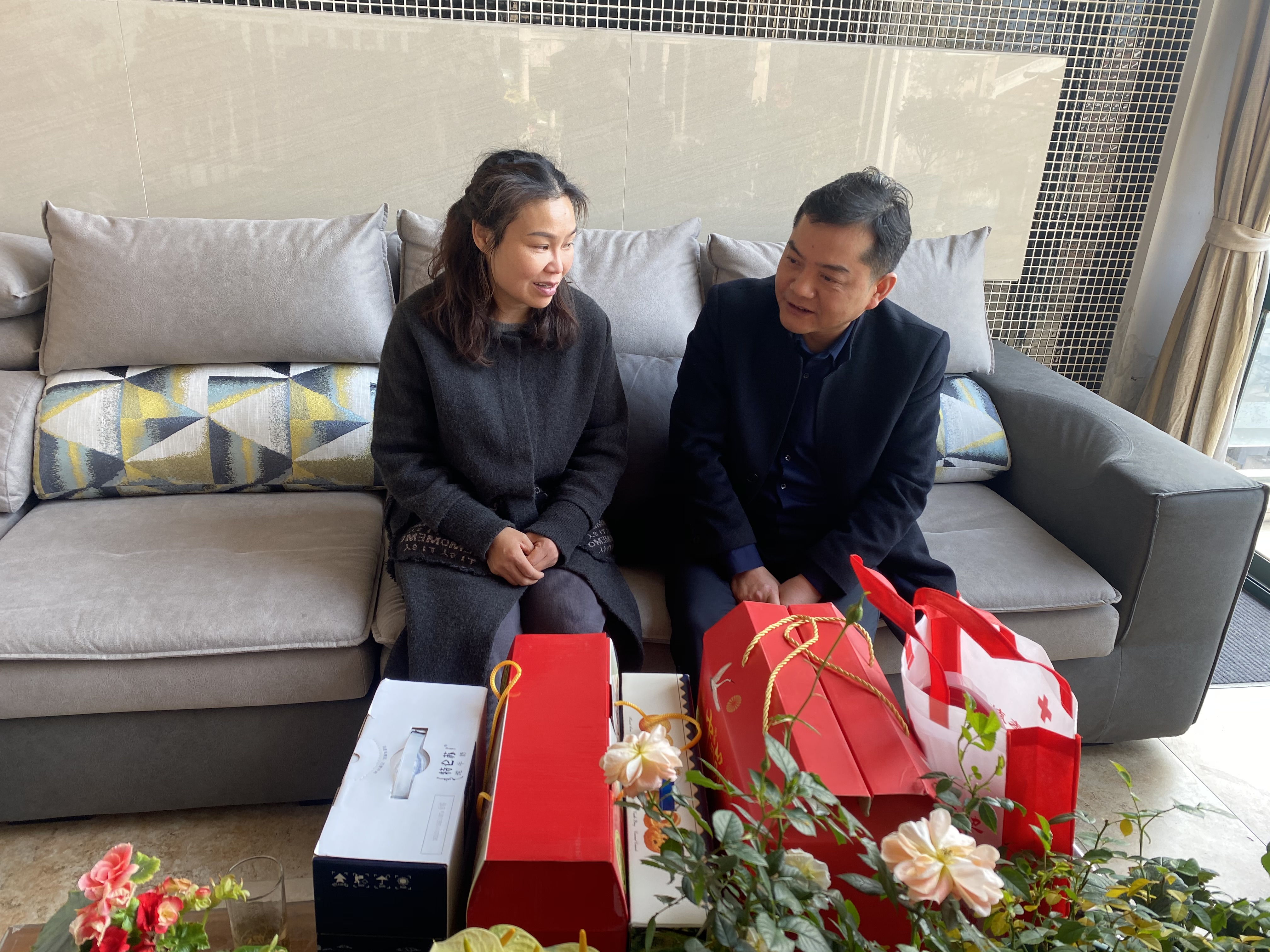 在慰问造血干细胞捐献者季良时,丁会长详细询问了解他的身体健康情况,向他介绍相关健康体检等服务,为他送上慰问品及新年祝福。