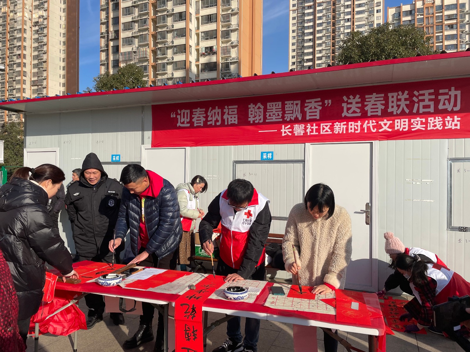 长安街道:1月14日,长安街道长馨社区在长馨家园广场内开展“迎新春 送福字”新春送福活动,邀请安安之家的老师及书法爱好者现场书写春联,吸引了辖区居民前来参与。在活动现场,书法老师们用“福”字开场,相同的字,不同的字体,传递着浓浓的心意,一张张笔酣墨饱的“福”字,表达着迎春纳福的祝愿。不一会儿,一幅幅带着美好祝福的春联呈现在大家面前,吸引了不少社区居民前来观赏。