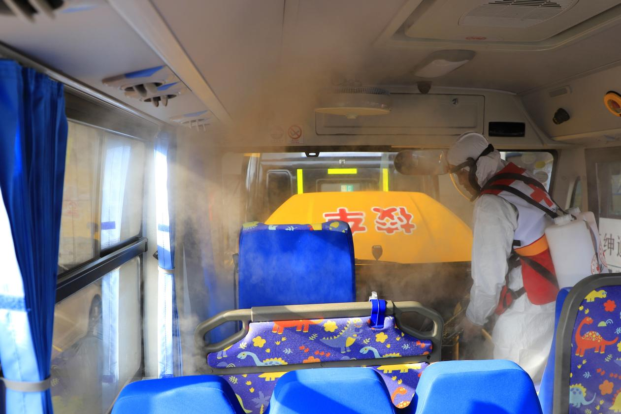 在对校车进行消杀前,消杀队员自身做好严密的防护,后对校车内外里的各个角落进行消毒。