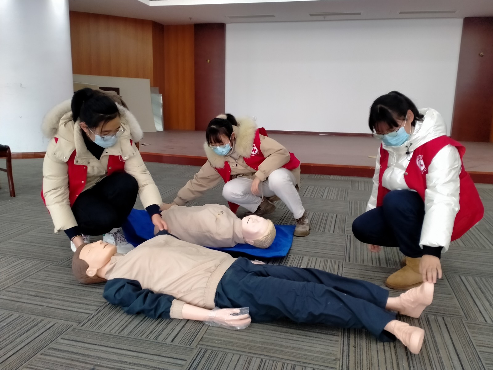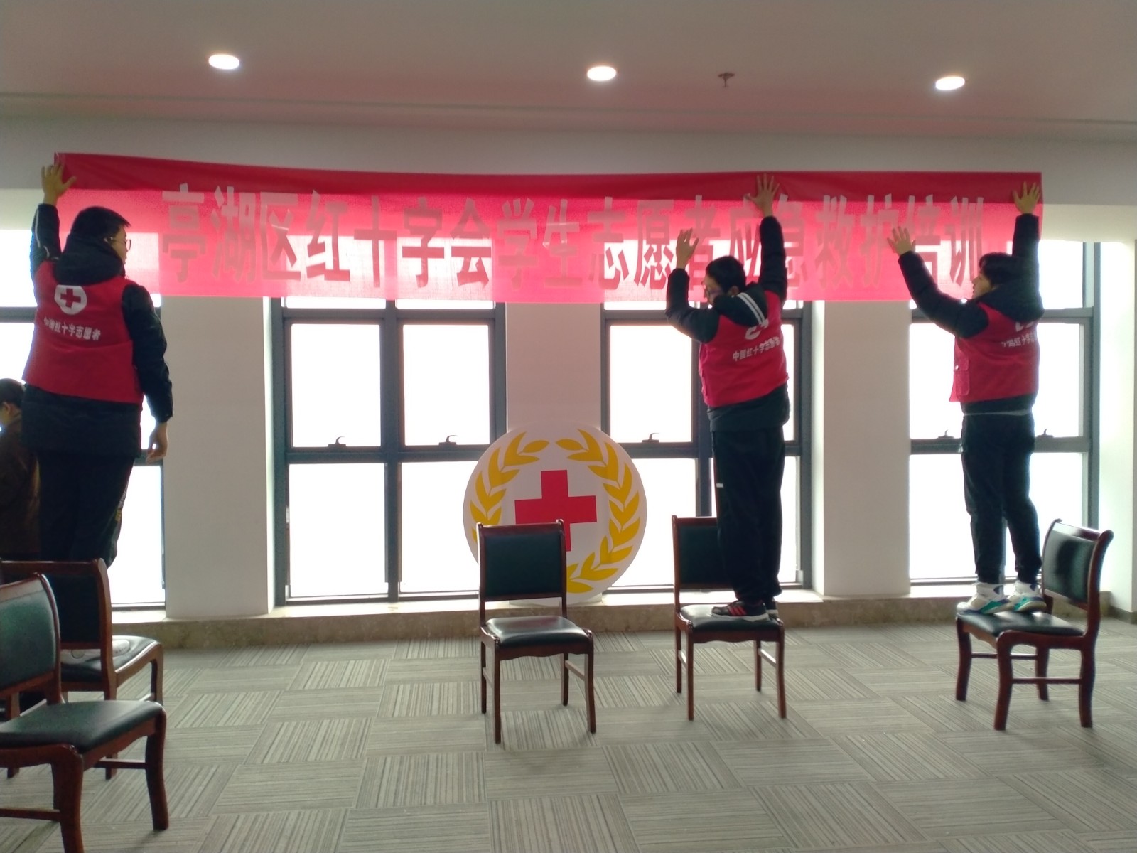 活动当天,志愿者们早早就来到现场,帮着布置会场。在红十字会工作人员的安排下,个子高的志愿者一起挂横幅、力气大的小伙子搬桌椅、小女生们按讲师要求把模拟人摆放到位,活动中大家自告奋勇走上讲台配合讲师做演示......每名志愿者都在以自己的实际行动体现“奉献、友爱、互助、进步”的志愿服务精神。