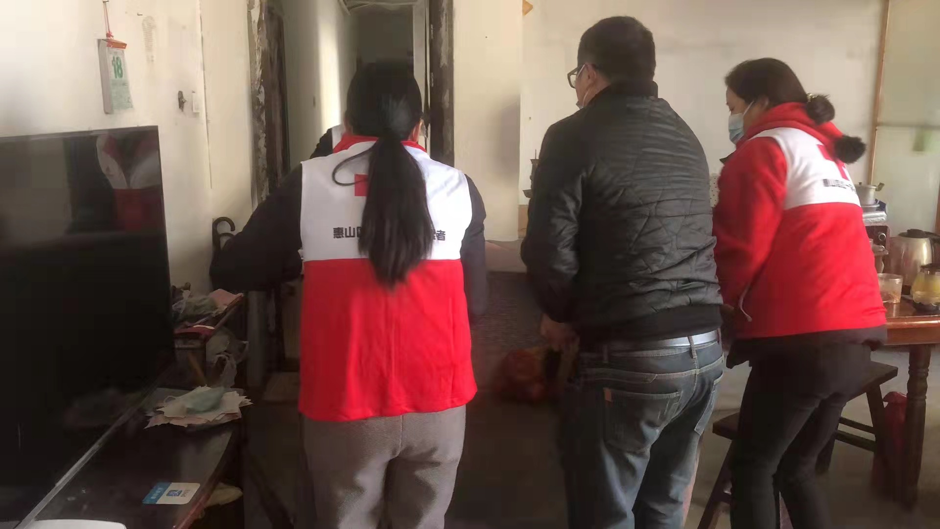 春节期间,惠山区前洲街道红十字会志愿者们来到辖区独居老人家中,开展“春节奉献爱心·情暖孤寡老人”志愿服务活动。
