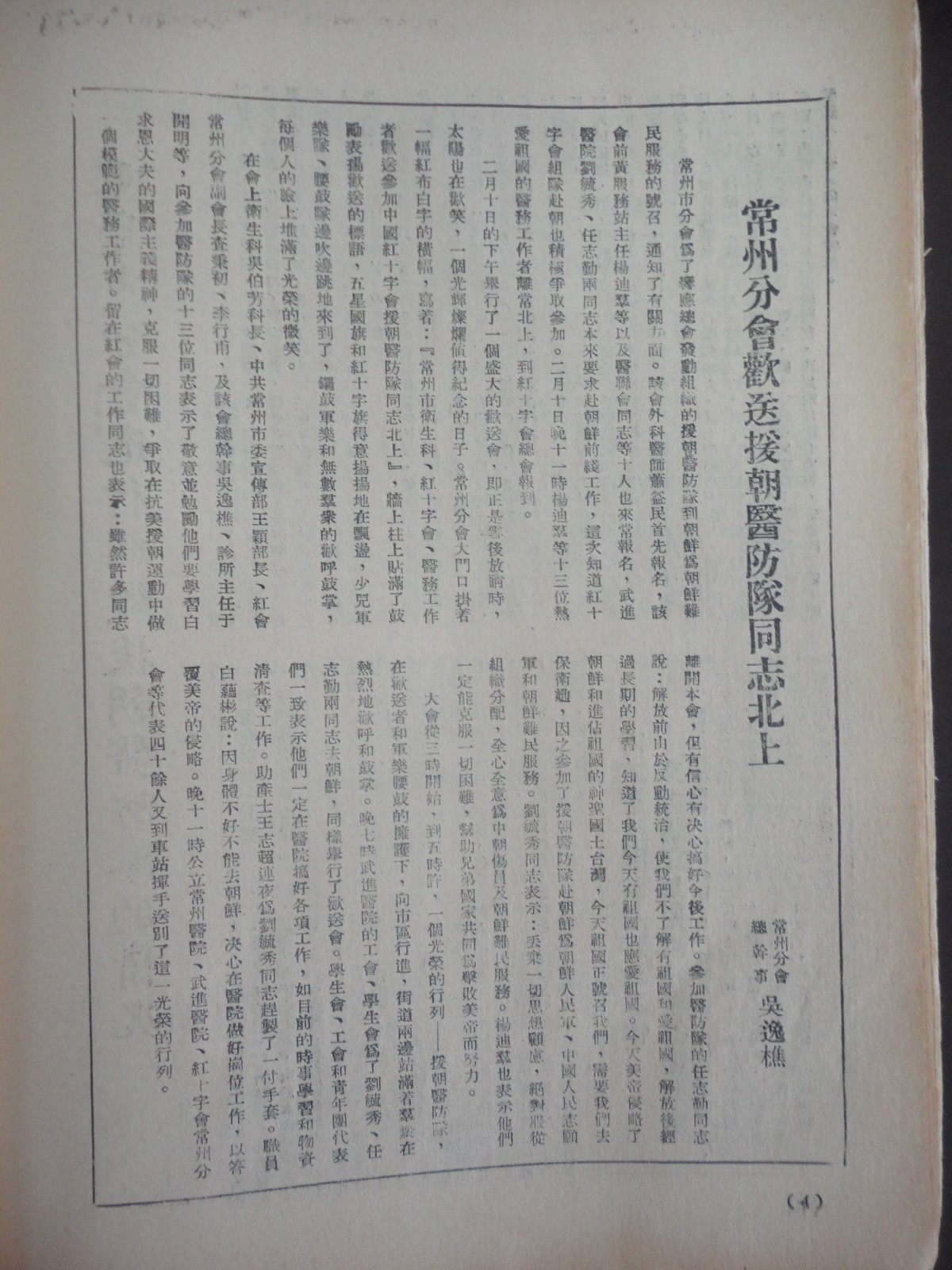常州分会外科医师萧益民第一个报名,分会前黄服务站主任杨迪群等十人也来常州报名,武进医院刘毓秀、任志勤两同志本来就要求赴朝鲜前线工作,这次知道红十字会组队赴朝也积极争取参加。2月10日下午,常州卫生科、红十字会联合举行欢送会,欢送参加中国红十字会援朝医防队的13名同志北上。现场气氛热烈,到处贴满了欢送标语,国旗和会期迎风飘扬,儿童军乐队和腰鼓队边吹边跳,很多群众前来送行。常州市委宣传部、常州市卫生科及分会领导向13名同志致敬,勉励他们学习白求恩大夫的国际主义精神,克服一切困难,争取在抗美援朝运动中做一个模范的医务工作者。刘毓秀表示:“摒弃一切思想顾虑,绝对服从组织分配,全心全意为中朝伤员及朝鲜难民服务。”杨迪群也表示一定能克服一切困难,帮助兄弟国家共同为击败美帝而努力。晚上十一点,四十多名各界代表欢送到常州火车站,目送十三勇士登车。