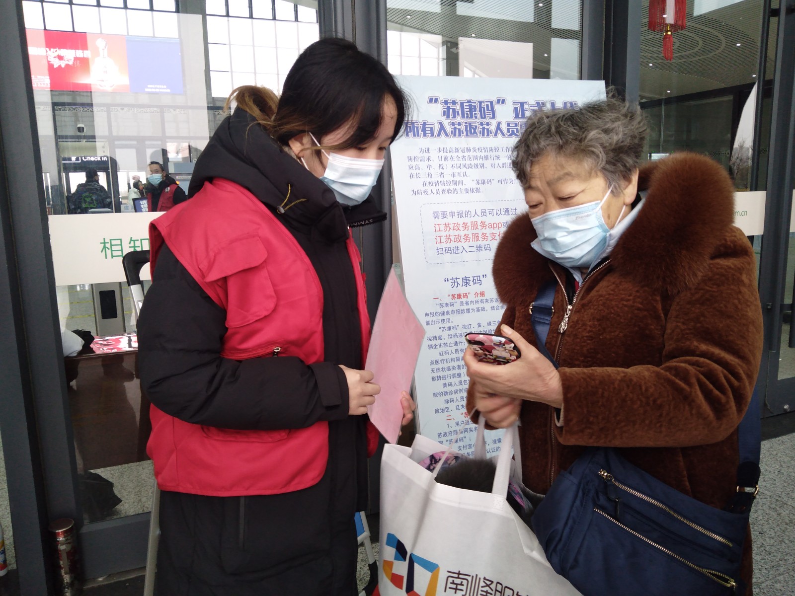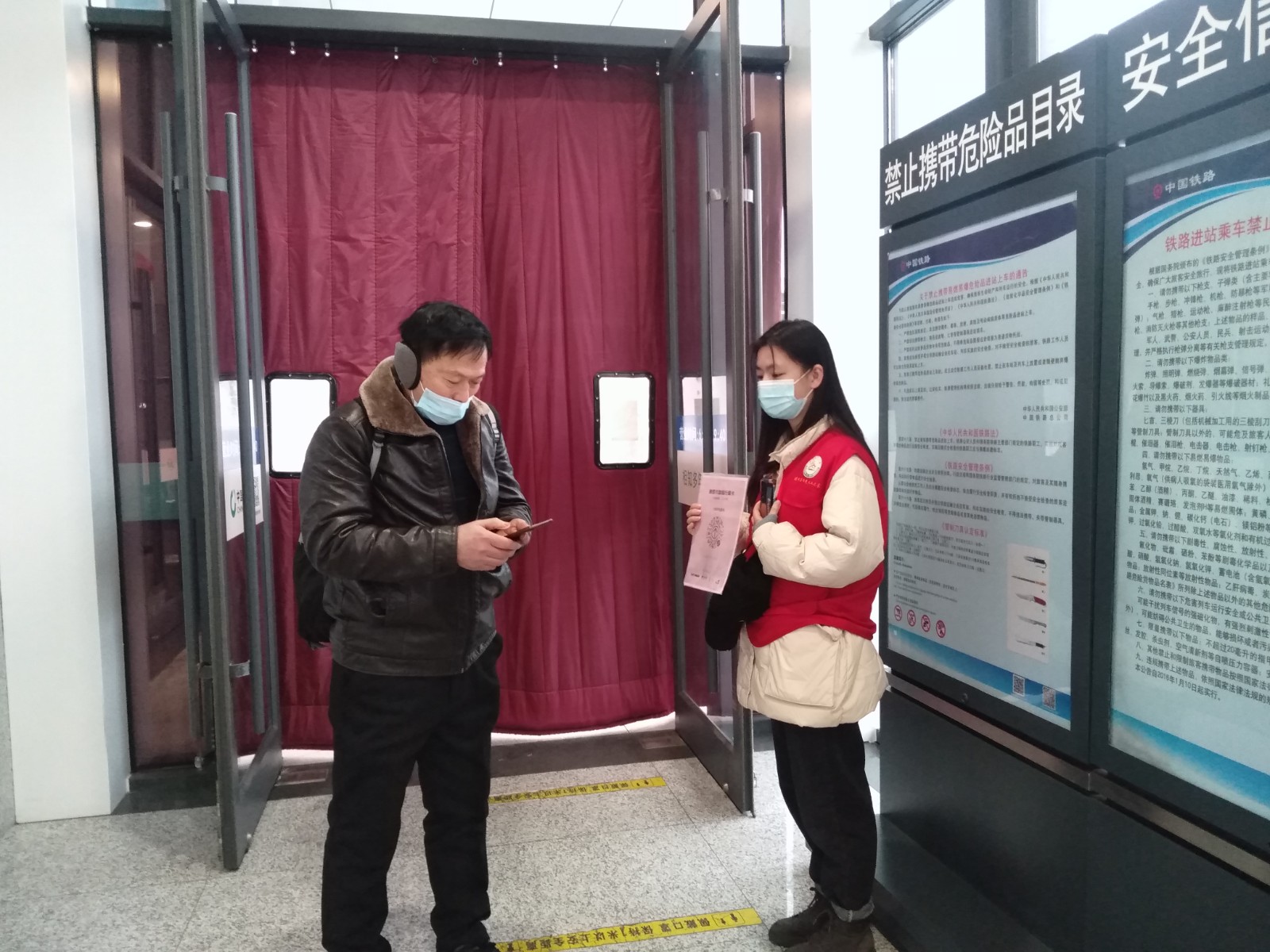 在春节期间,县红十字会阳光义工志愿者们来到县高铁站,帮助旅客们查验苏康码、行程码,帮助老年旅客拿取行李物品,分发应急救护知识宣传单页,保障健康出行。