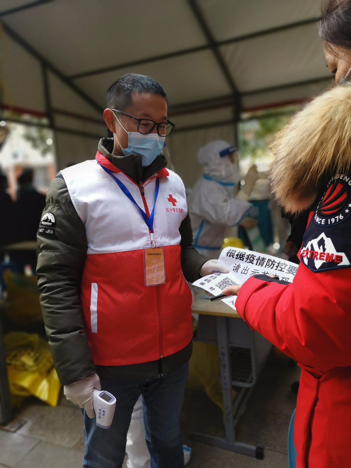 “您好,请先扫下这个二维码登记上”、“请自觉间隔1米以上距离”……一抹抹红色的身影穿梭人群中,不厌其烦地指导市民如何在手机上进行操作,一遍又一遍地回答各种问题。