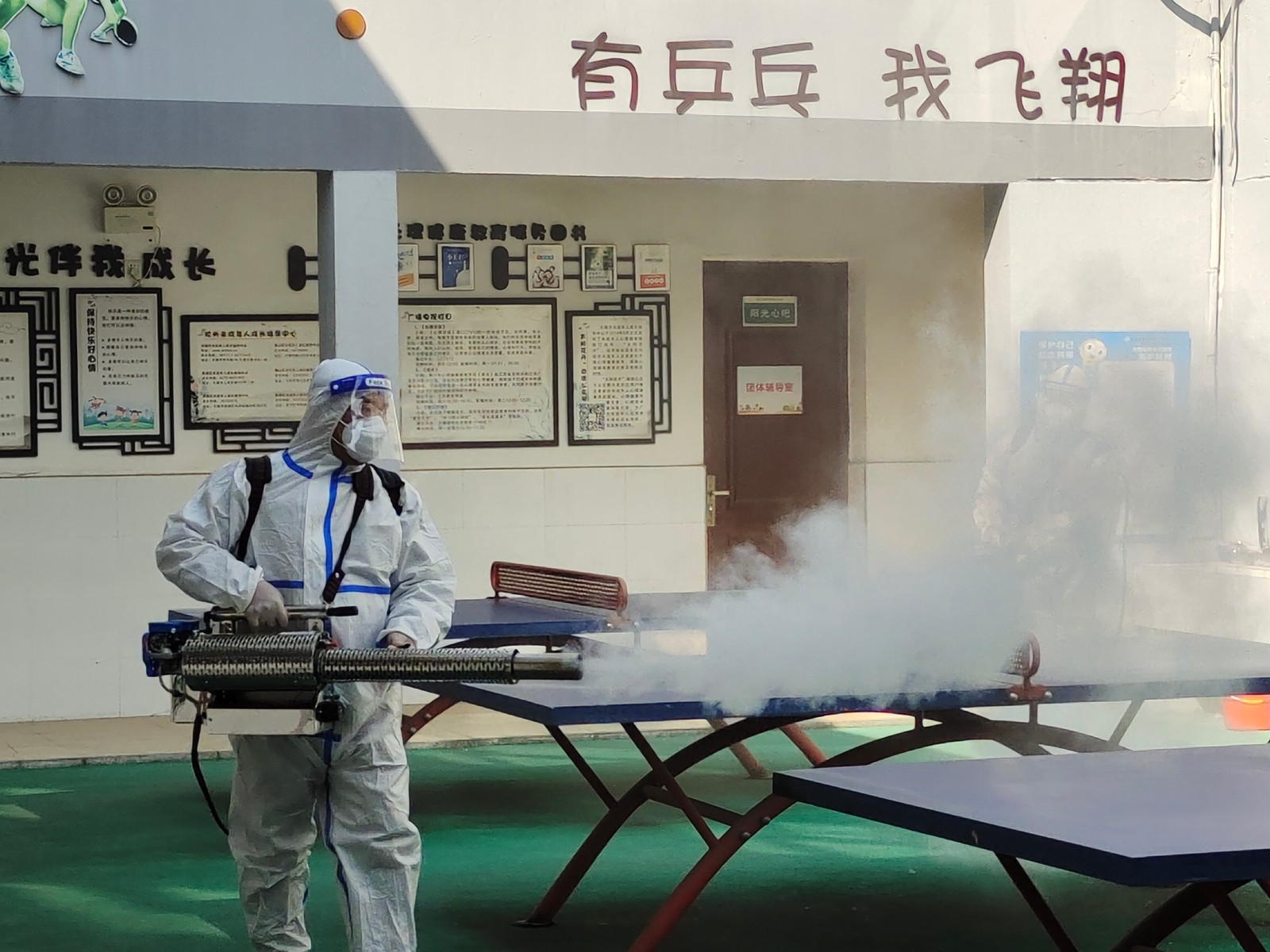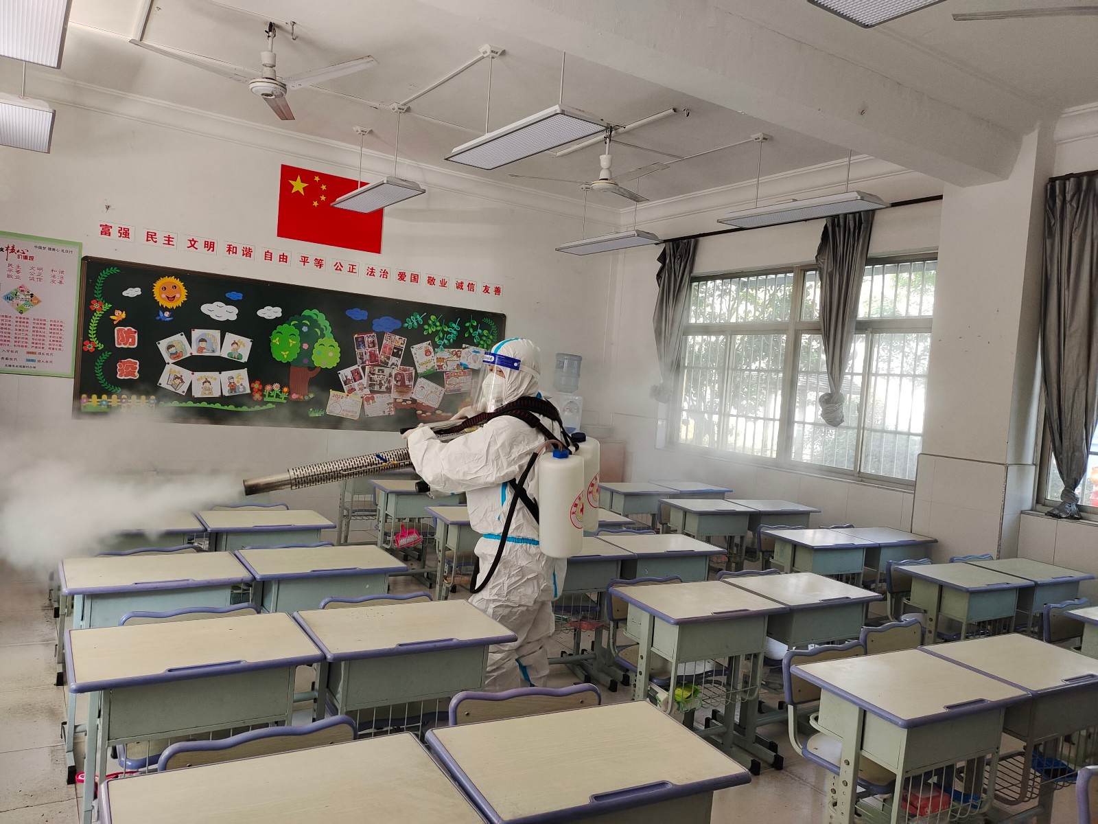 队员们严格按照《新型冠状病毒肺炎防控方案》要求,遵循全面消杀和重点消杀相结合的原则,对照消杀标准,用专业设备对校园进行“地毯式”消杀。救援队队员们穿梭于教室、餐厅、活动室、卫生间、楼梯、走廊、操场、地下车库等校园的各个角落,确保消杀有效彻底。