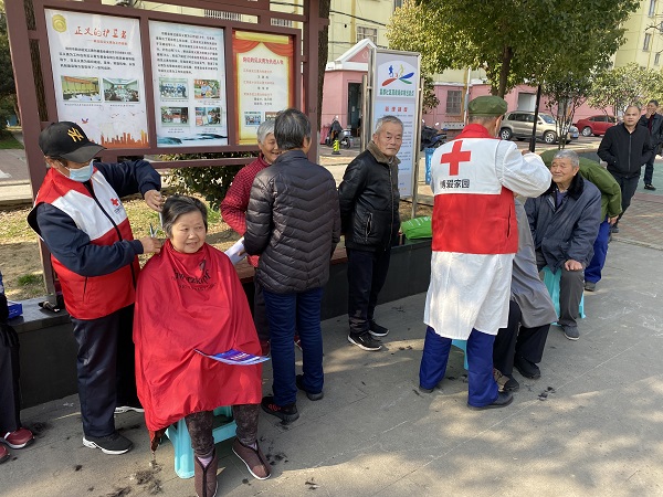 在活动开展的同时,一场集公益志愿服务、政策项目宣传于一体的社区便民集市热闹开始。健康义诊、爱心理发、项目宣导、慈善义卖、康养产品展示......志愿者们用自己的专业知识为居民们提供各类咨询、志愿服务。
