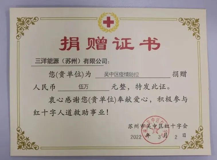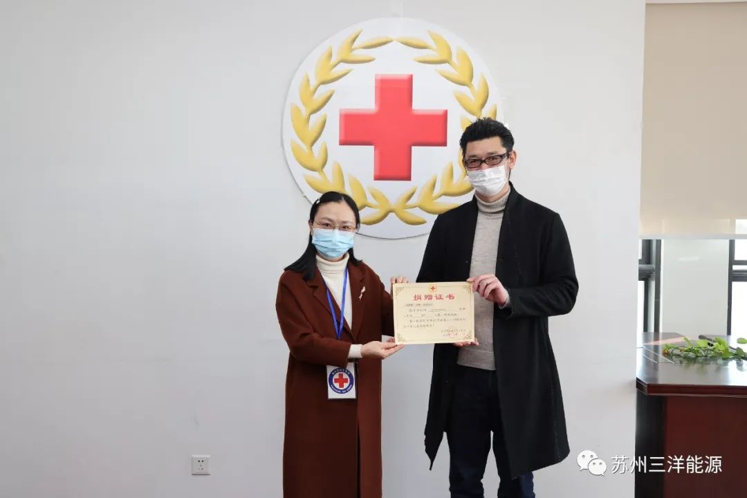 3月4日,三洋能源(苏州)有限公司向吴中区红十字会捐赠5万元现金,助力吴中区疫情防控工作。