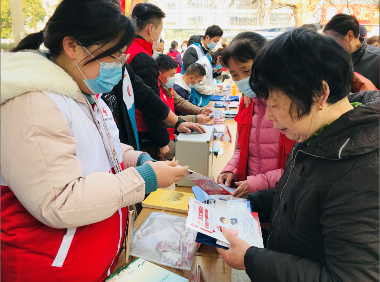 在“3.5学雷锋日”到来之际,红梅街道北环新村社区健身广场上人头攒动、热闹非凡,3月3日上午9点,由北环新村社区红十字会、辖区内各行各业的志愿者携手组织的便民服务集市活动在这里开展。