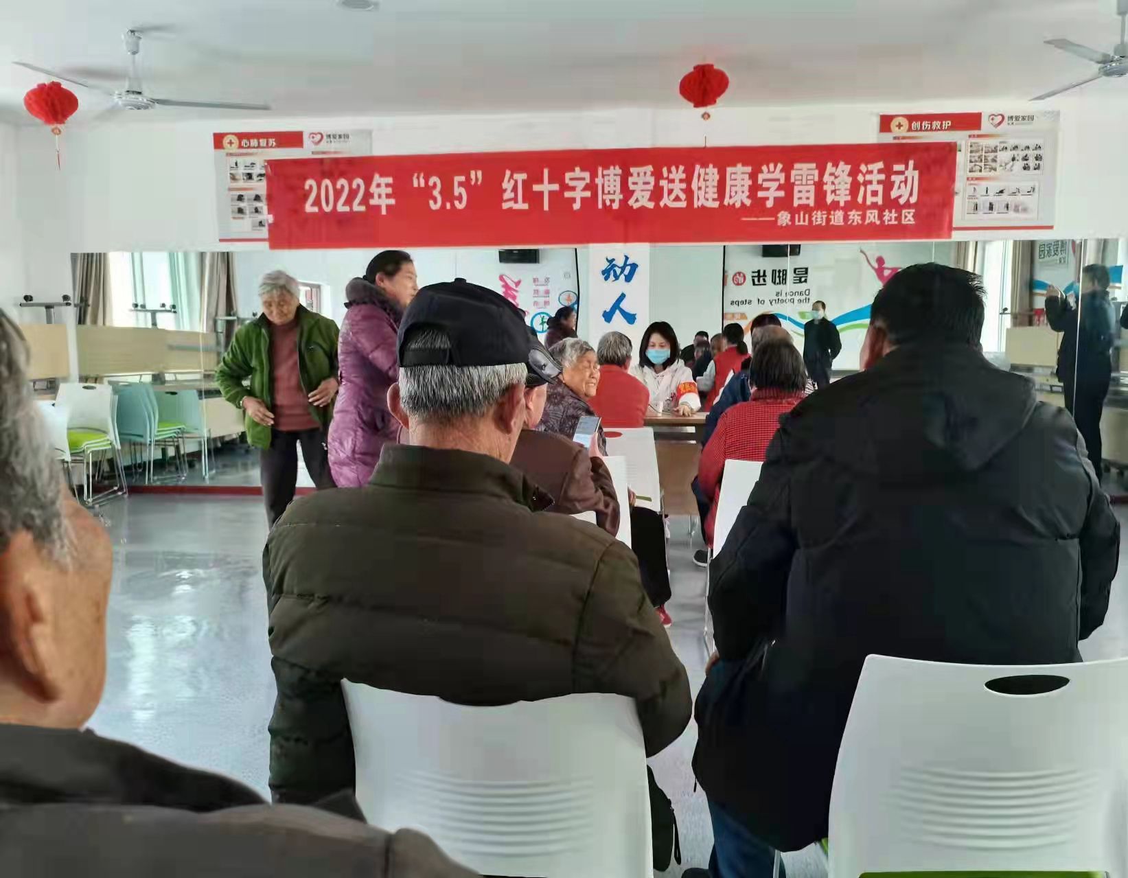 第59个“学雷锋”纪念日即将来临,为大力弘扬学雷锋志愿服务精神,彰显红十字的“人道 博爱 奉献”精神, 3月4日京口区红十字会组织区红十字会会员单位大市口社区卫生服务中心和江苏协兴建筑安装工程有限公司,在象山街道东风社区博爱家园开展2022年“3.5”红十字博爱送健康学雷锋主题活动。