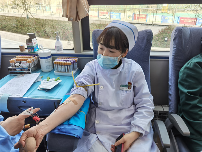 “全国无偿献血奉献奖金奖”“全国优秀志愿者”杨小飞指导大家登记表格,宣传无偿献血知识。抗疫英雄、造血干细胞捐献者卞红红也向大家介绍了捐献造血干细胞相关知识,并现场献血。