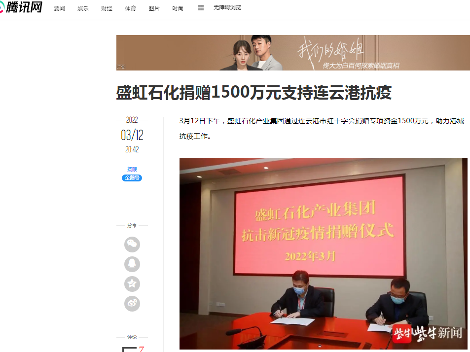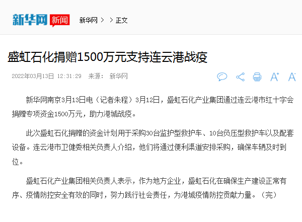 [连云港市]《盛虹石化捐赠1500万元支持港城抗疫》引多方媒体报道