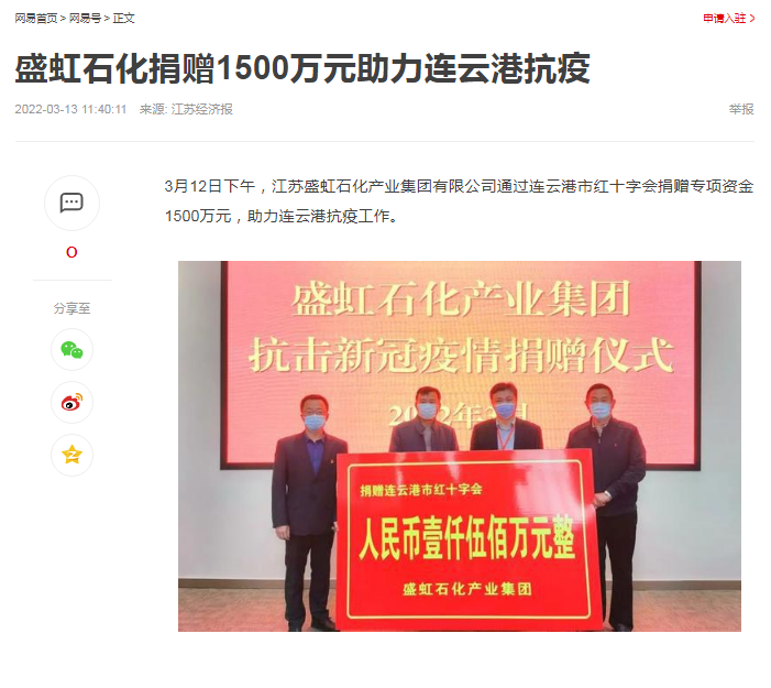 3月12日下午,盛虹石化产业集团通过连云港市红十字会捐赠专项资金1500万元,助力港城抗疫工作。信息一经发布引起了各大媒体的广泛关注。
