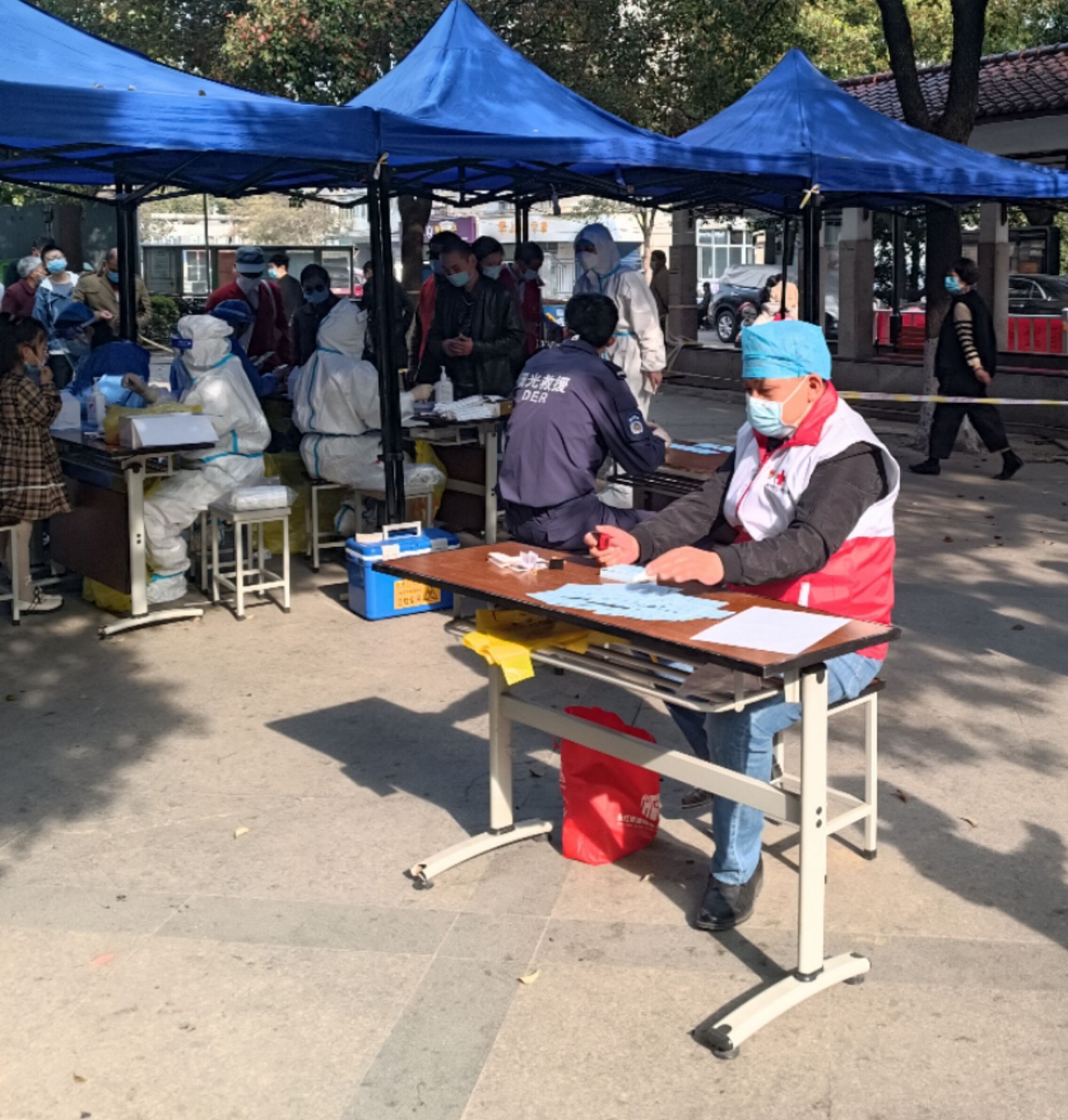 武进区闵市村的红十字志愿者,第一时间投入全员核酸检测的志愿服务。