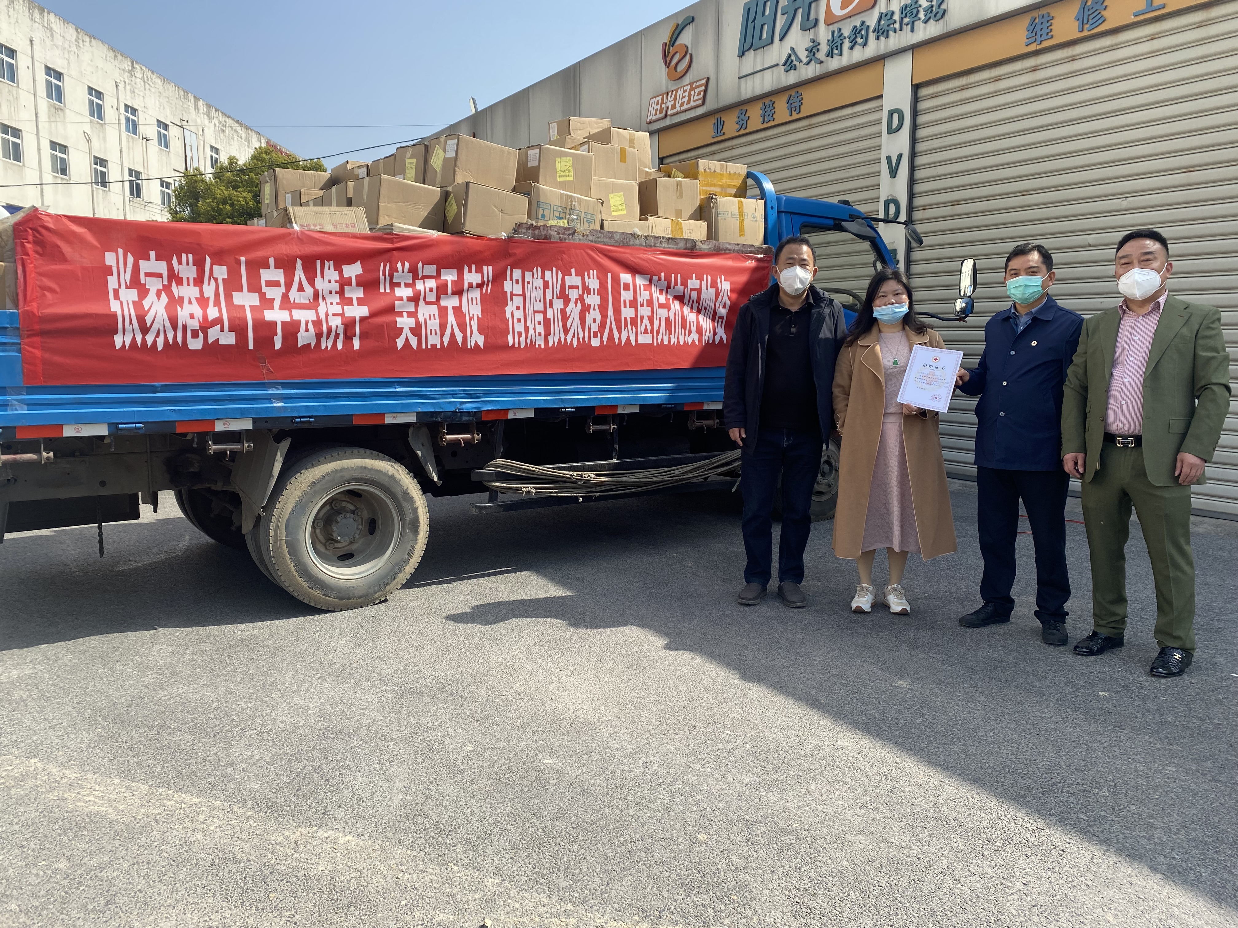 3月29日下午,江西美福健康管理集团有限公司向张家港市红十字会捐赠一批外科口罩、消毒湿巾、消毒液等价值3.49万元的防疫物,定向用于市第一人民医院新冠疫情防控工作。
